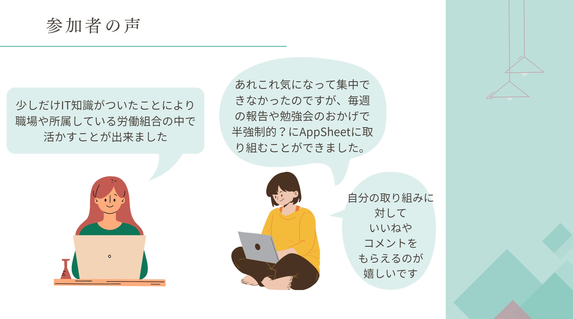 注目のノーコード開発プラットフォーム、「AppSheet」をメインに学ぶスクール。初心者向けに1から学ぶことができ、どなたでも業務アプリケーションが作成できるようになります。