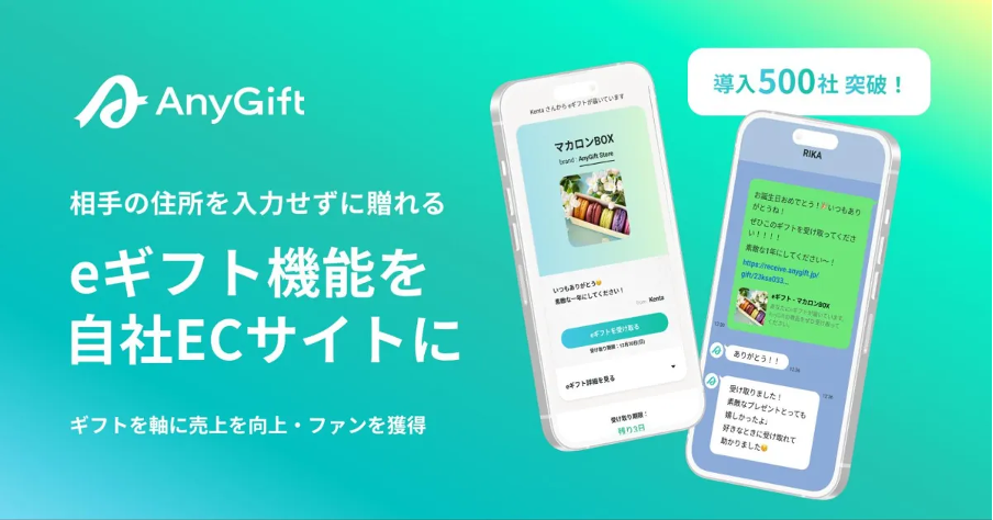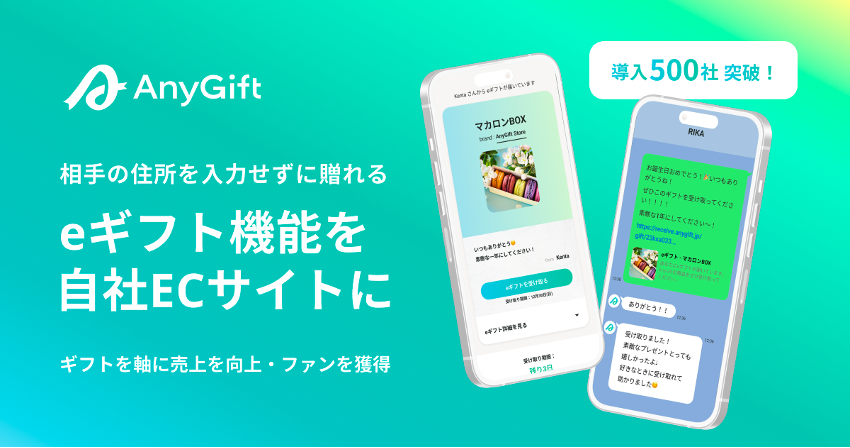 『AnyGift(エニーギフト)』は、相手の住所を知らなくてもLINEやメールで贈れる"eギフト機能"を、自社ECサイトに組み込み・導入ができるサービスです。