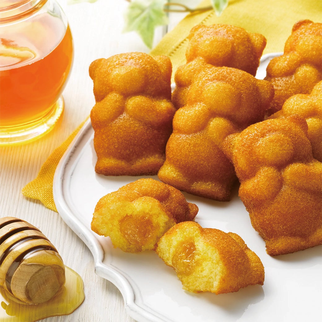 美瑛小麦100%のラ・テールオリジナルブレンド小麦粉「美瑛の空」や、北海道産シナノキのはちみつなど、原材料にこだわったマドレーヌです。かわいいくまさんの形で、中には北海道産はちみつのゼリーが!