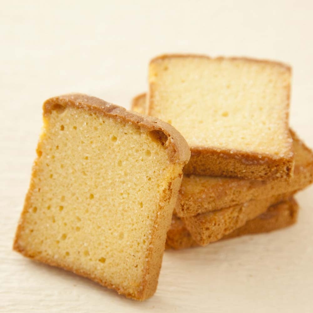 国産のはちみつでしっとりと焼き上げたカステラをスライスして、発酵バターをひと塗り。さらにオーガニックシュガーを振りかけて再度じっくりとオーブンへ。手間暇かけたラスクです。