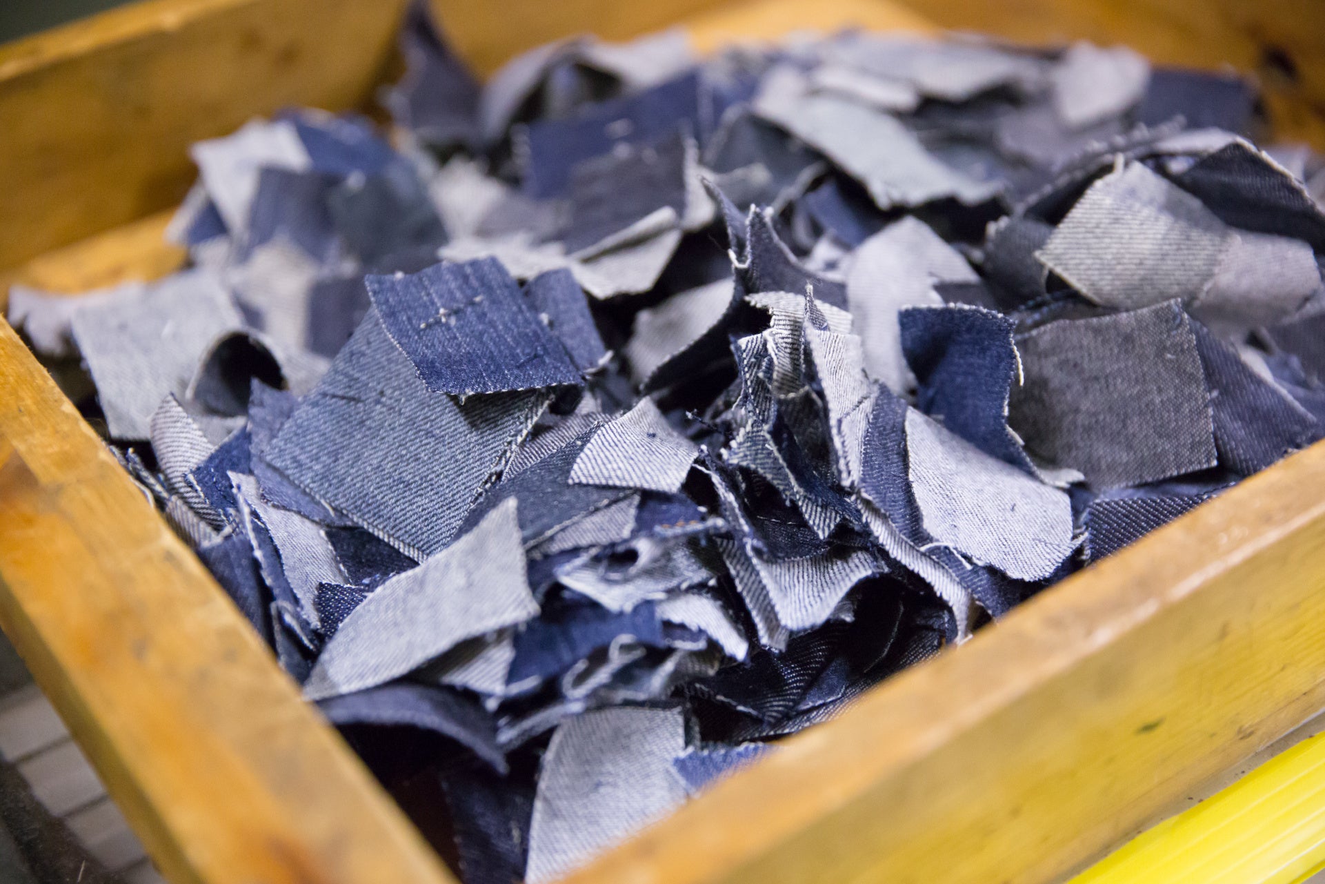 ユーズドデニムをアップサイクルしたDENIM MIXシリーズは、回収したデニムをしっかりと洗浄し、手作業により金具やパッチなど取り外し解体、使用できる部分を選別した上で細かくカットしていきます。長野県の大町市にある自社紡績工場で粉砕してオープンエンド糸へと生まれ変わっていきます。その糸を使って編んだ生地には青みがかった霜降りや、ところどころにネップのようなデニムのかけらなど、独特な色合いと風合いが現れます。