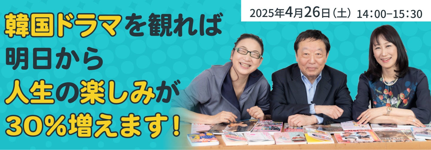 2025年4月26日は、辛淑玉さん、寺脇研さん、松本侑子さんによるトークイベント「韓国ドラマを観れば明日から人生の楽しみが30%増えます!」を開催いたします。