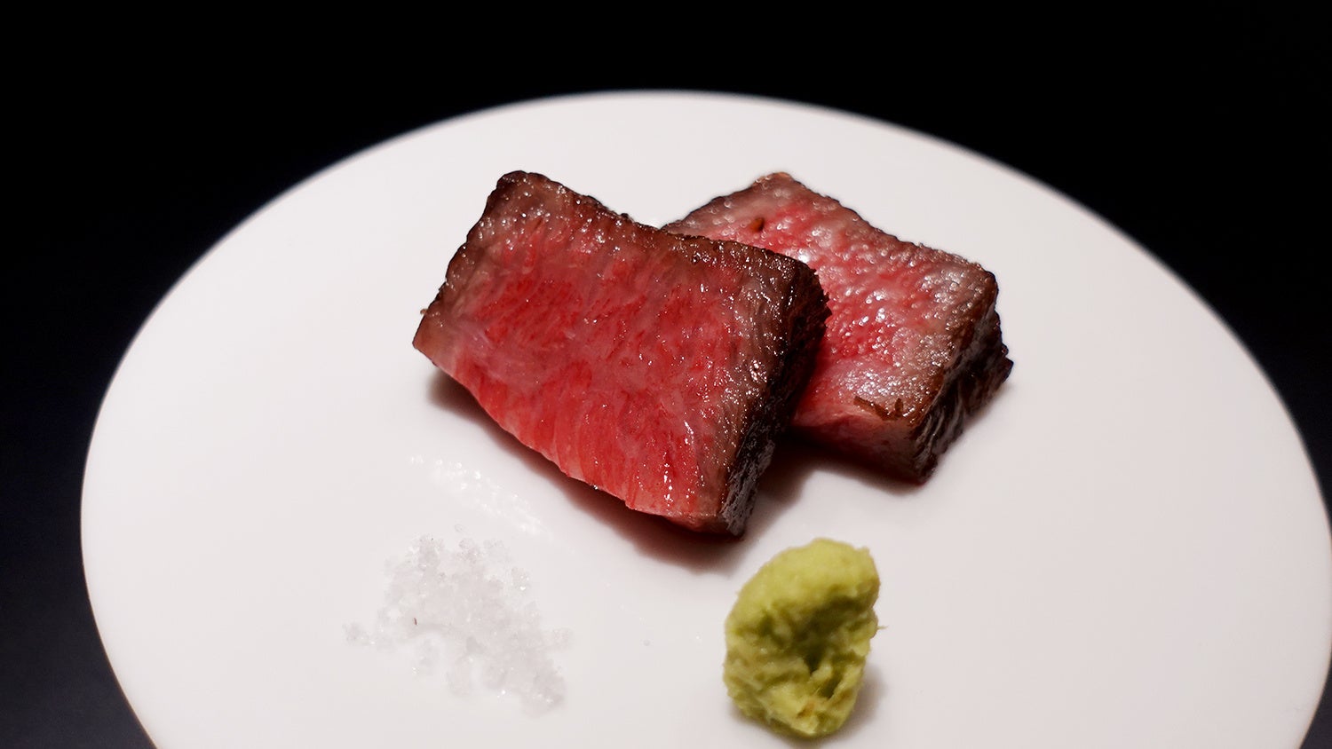 ミディアムレアに焼き上げた石垣牛の旨味を、岩塩とわさびでシンプルに味わっていただく和牛焼き。