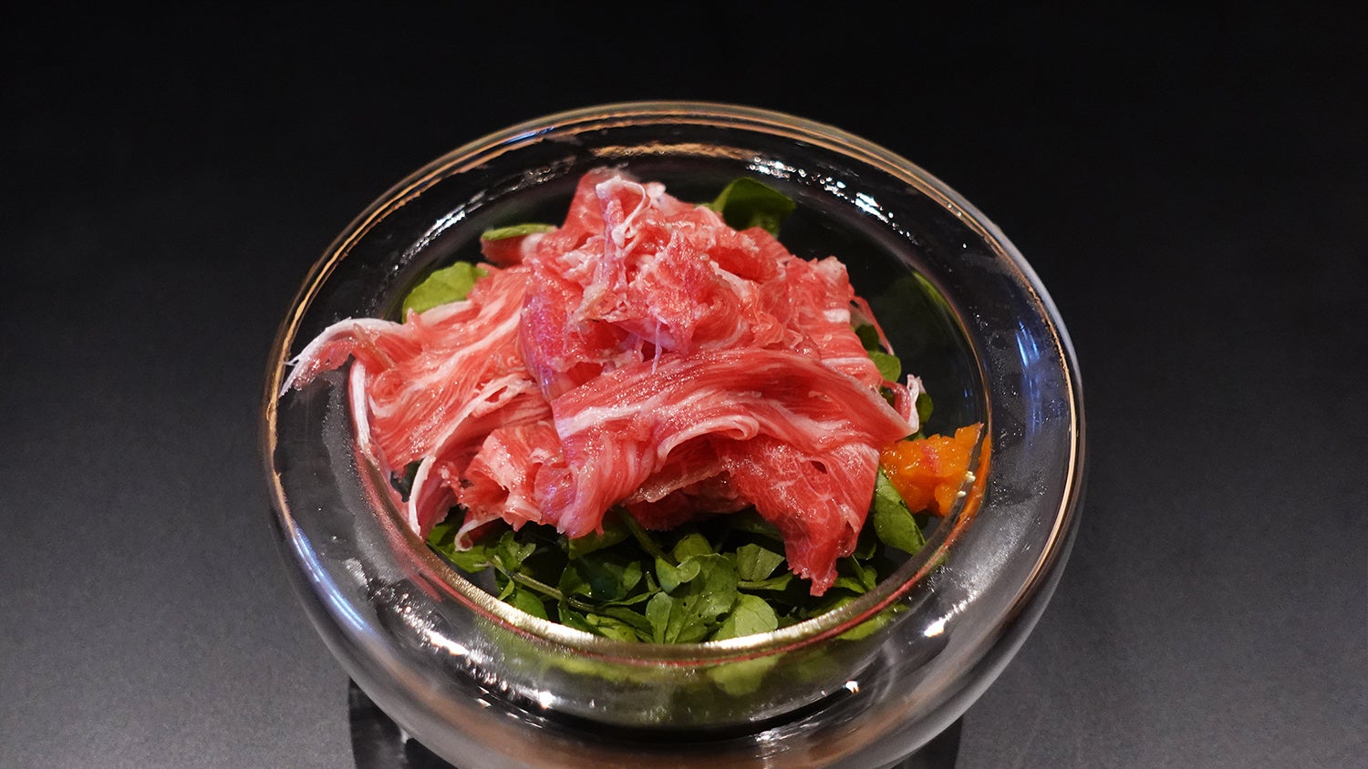 麺状にカットした石垣牛に、お肉とよく合うはまぐりの出汁を合わせた和牛そうめんです。
