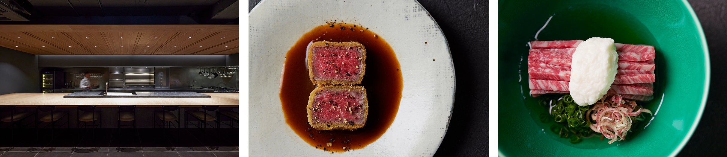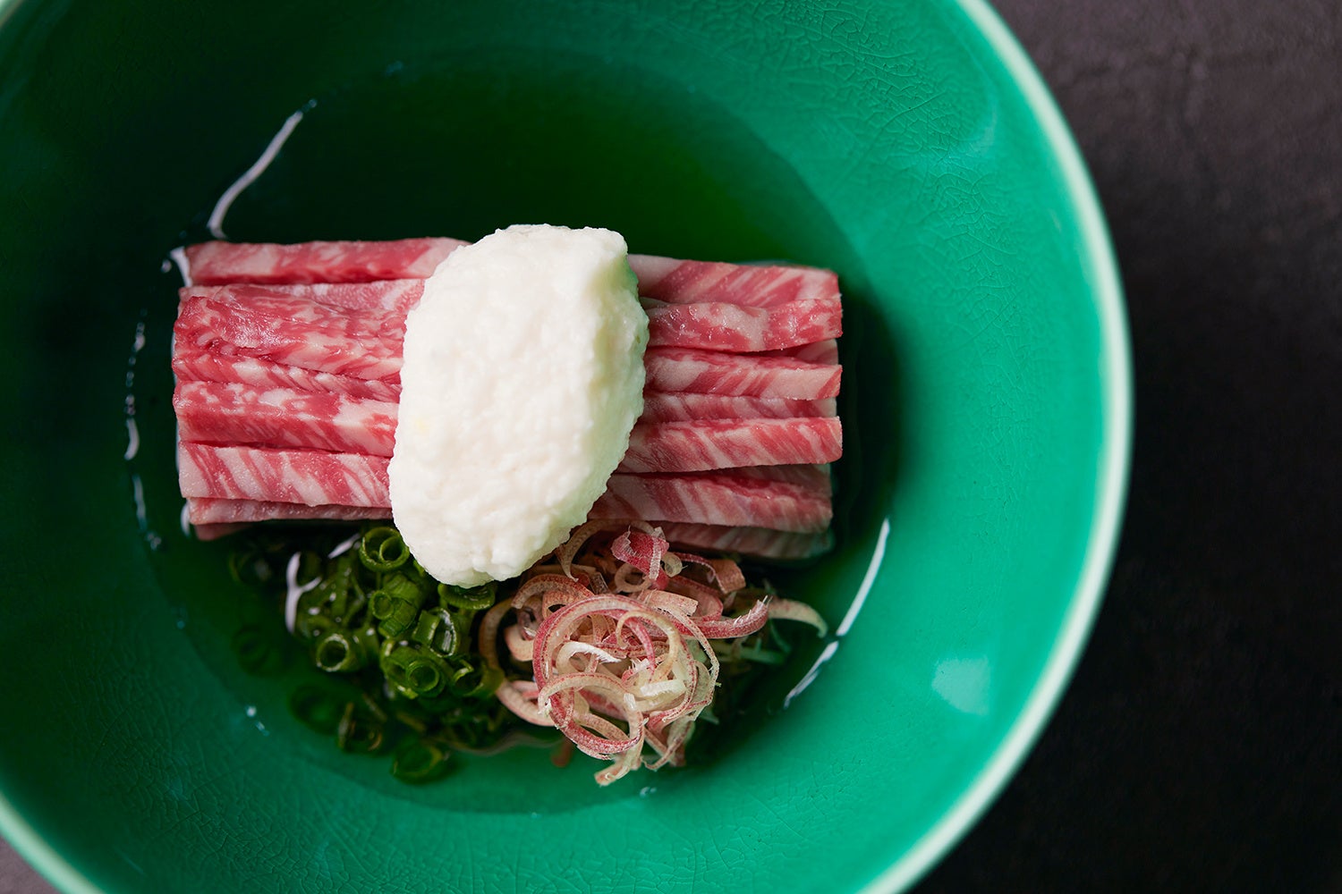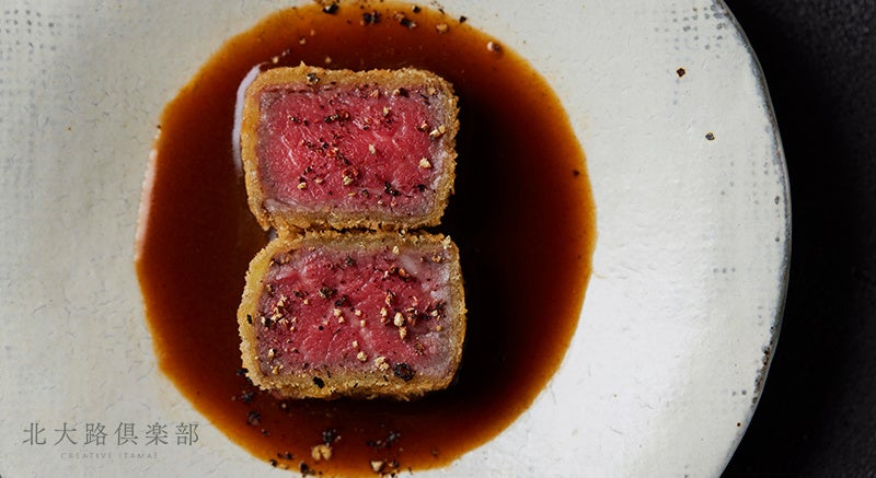 いつ訪れても新しい体験が待つ『北大路倶楽部』のカウンターには、和食の様式にしばられず、自由な発想で繰り出される多彩なメニューが並びます。第1弾は、石垣牛を使った肉割烹です。手作りウスターソースと合わせた和牛ヒレカツや貝出汁で食べる和牛そうめん、牡丹海老とともに味わう和牛手巻きなど、遊び心を大事に手間暇かけたメニューを小皿で少しずつ提供するおまかせ肉割烹コース(16,500円/税込)をご提供します。石垣牛は年間750頭しか出荷されず、そのほとんどが島内で消費される希少なブランド牛。温かな気候でストレスなく育った牛は上質で風味豊かです。当社では、コロナ禍で観光客が減り石垣島の生産者が苦境に立たされた時に積極的に取扱いを開始した経緯から、需要が回復した今も安定的な仕入れが可能となっています。