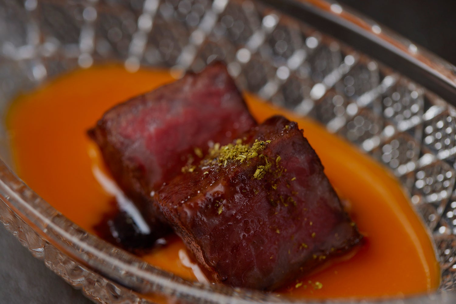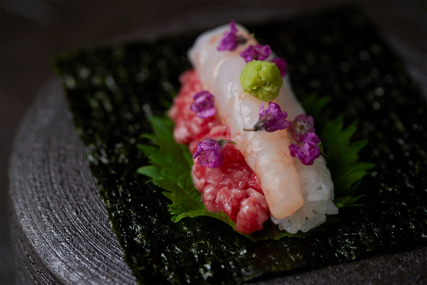 昆布締めにした牡丹海老と石垣牛のコラボ。別添えのキャビアを乗せてお召し上がりいただきます。