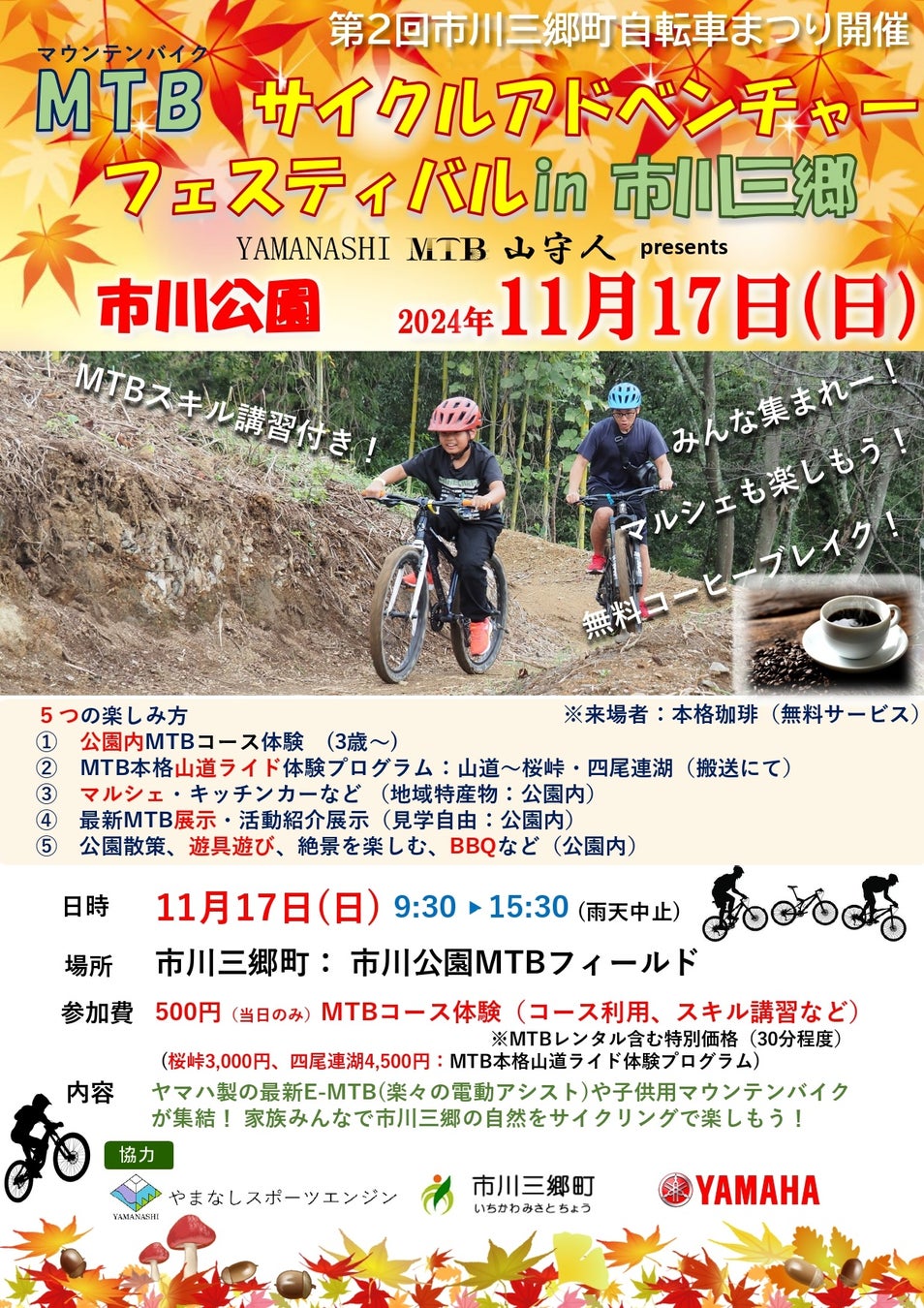 11/17(日)「MTBサイクルアドベンチャーフェスティバルin市川三郷」を半世紀ぶりに先月リニューアルされた山梨県市川三郷町の市川公園にて開催決定!マルシェも来る!
