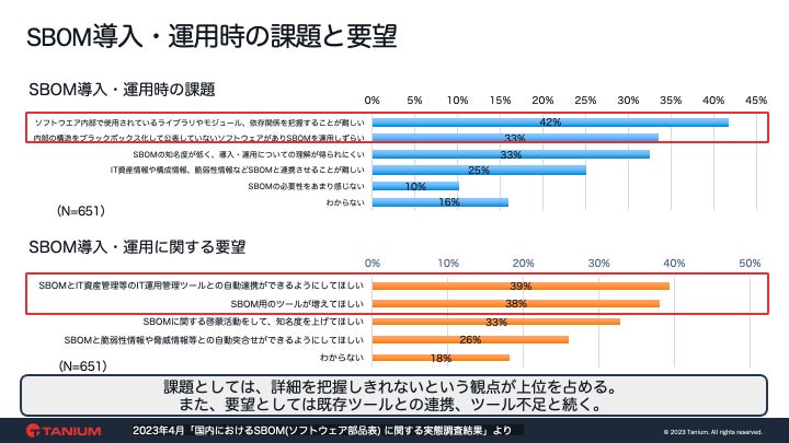 2023年4月25日 – 業界唯一の統合型エンドポイント管理(XEM)(*1)プラットフォームのプロバイダであるタニウム合同会社(本社:東京都千代田区、アジア太平洋日本地域プレジデント 兼 日本法人代表執行役社長:古市 力、以下タニウム)は本日、国内におけるサイSBOM市場調査の結果を発表しました。本調査の結果から、SBOMの認知度は高まっているものの、管理を実践できている企業はまだ少なく、そのためのツールの不足や、対応が俗人的になっているなどの課題があることが明らかになりました。また企業の関心は、ビルドSBOMと言われる開発環境におけるSBOMではなく、既存環境に展開されているアプリケーションのSBOMにあることも判明しています。