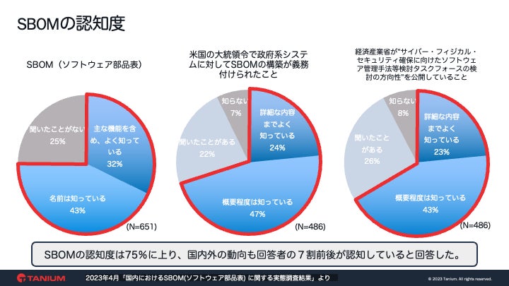 ・SBOMの認知度は75%に上り、7割前後が国内外の動向を認知