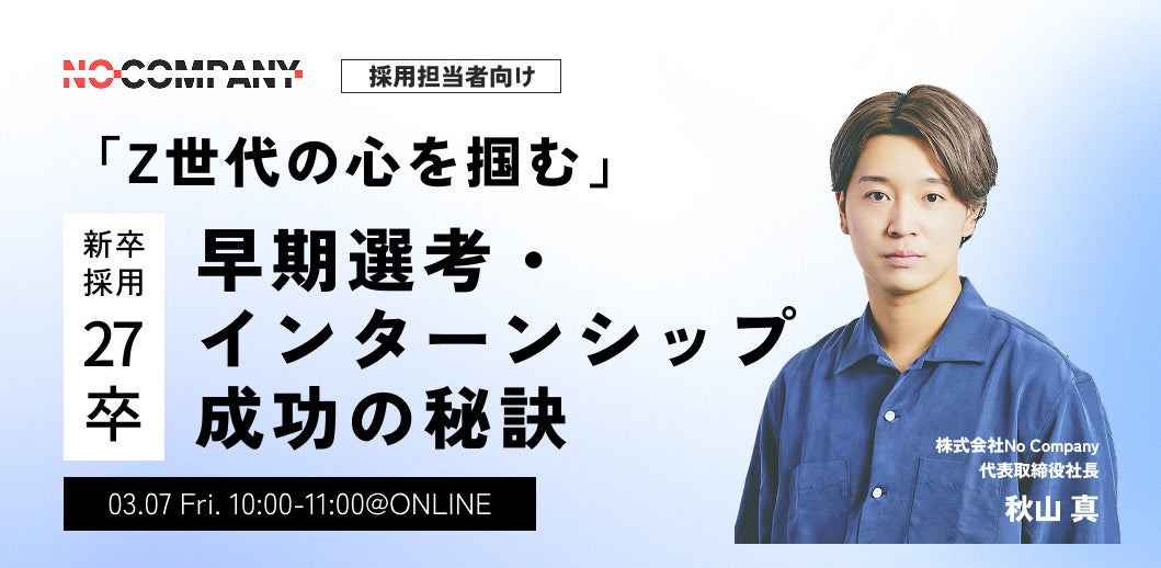 企業の人事部門向けに採用マーケティング支援を行う株式会社No Company(本社:東京都港区、代表取締役:秋山真)は、この度、自社の採用施策や内定承諾率に悩む採用・人事向けイベント「早期からZ世代の心を掴む! 選考参加に繋がるインターンシップ設計」を3月7日(金)に開催します。自社が「候補者に選ばれる」ための早期選考・インターンシップの『成功の秘訣』を、最新の新卒トレンドを交えながら解説します。