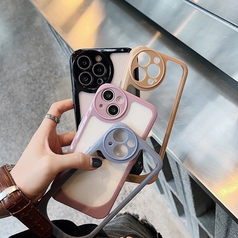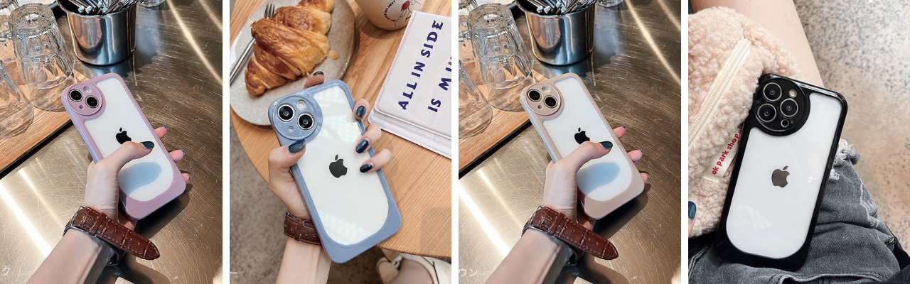 カメラ部分の丸いデザインが特徴的なクリアケースです。同色のフレームがシンプルすぎずスマートな印象をもたらします。背面は本体カラーをそのままでも、ステッカーなどでアレンジするのも楽しいデザインです。くすみカラーも可愛い全4色からお選びください。