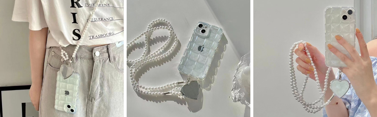 真っ白なパールと透明なケースが夏らしいスマホショルダーです。立体感が涼しげな印象を引き立たせるクリアケースには本体の色が映ります。開けばミラーに早変わりのハートチャームがアクセントです。