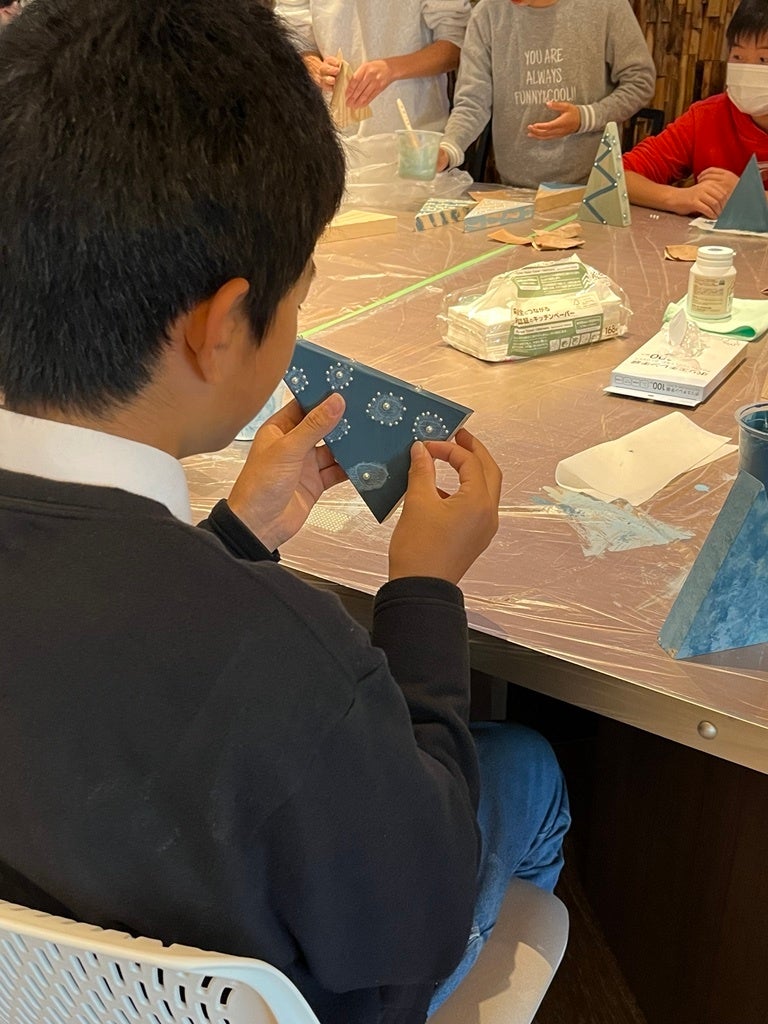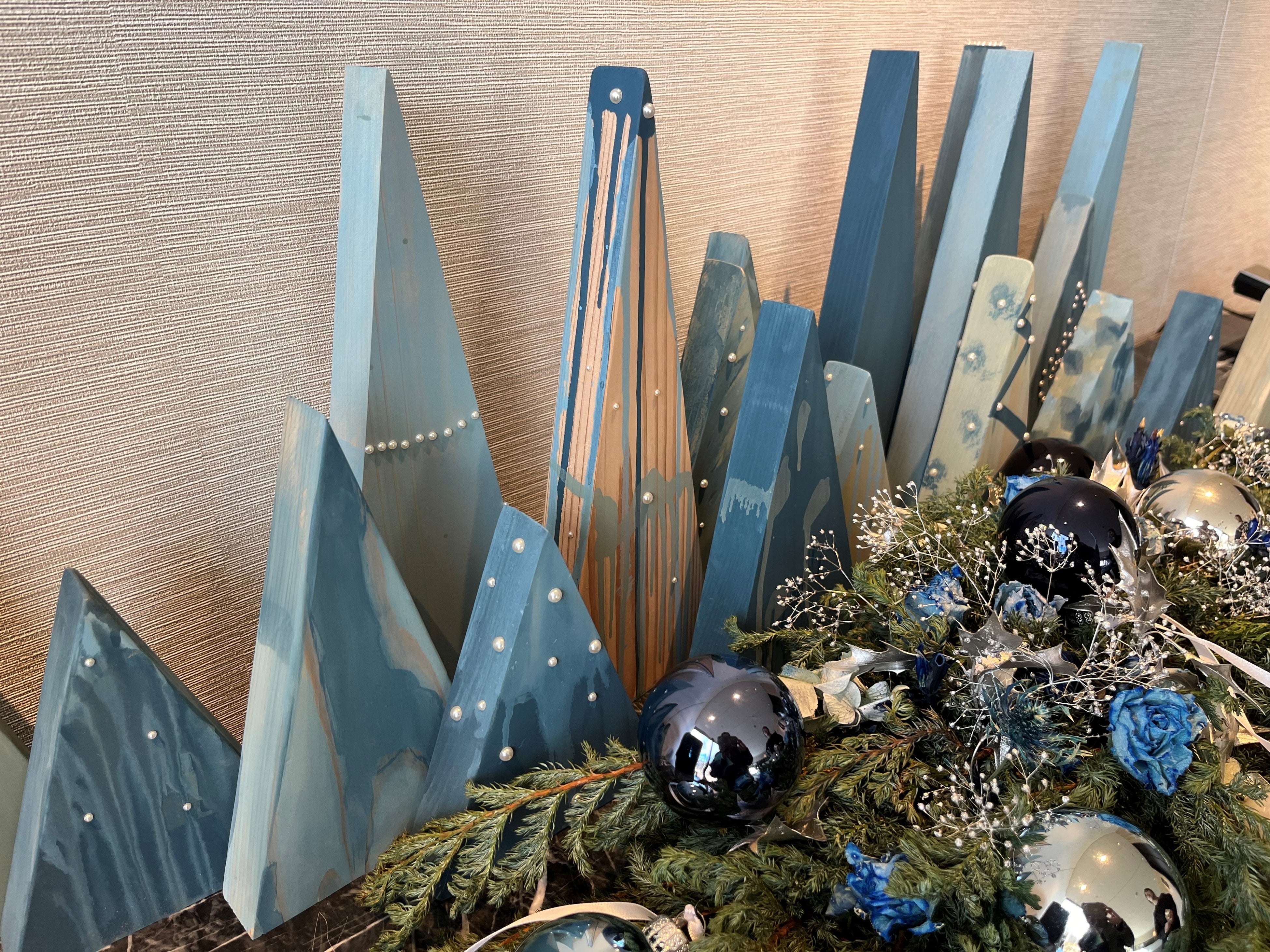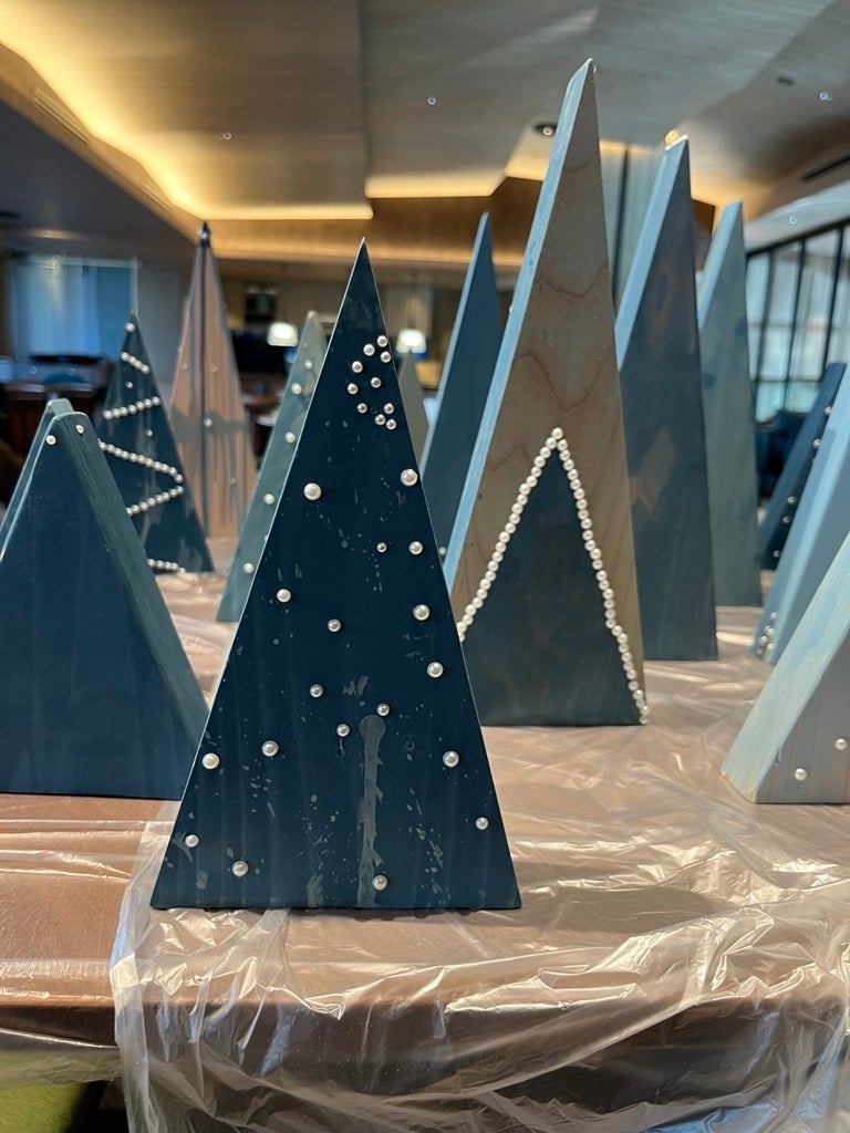 オールデイダイニング「KAGARIBI」や、宿泊棟などには、ホテル周辺地域の軽井沢学園の子どもたちがワークショップで作成したミニツリー型のオブジェを展示しています。ワークショップでは、ツリーと同じく、長野県の根羽村の間伐材を使用した木材をやすりで削り、絵具を塗り、デコレーションをし、ミニツリー型のオブジェを作りました。当日は、子どもたちの自由な発想で、ブルーのツリーオブジェを制作しました。完成後、「ツリーの街ができたね!」という子どもたちの感想の通り、それぞれの作品が織り成す、あたたかなブルークリスマスの世界をお楽しみください。