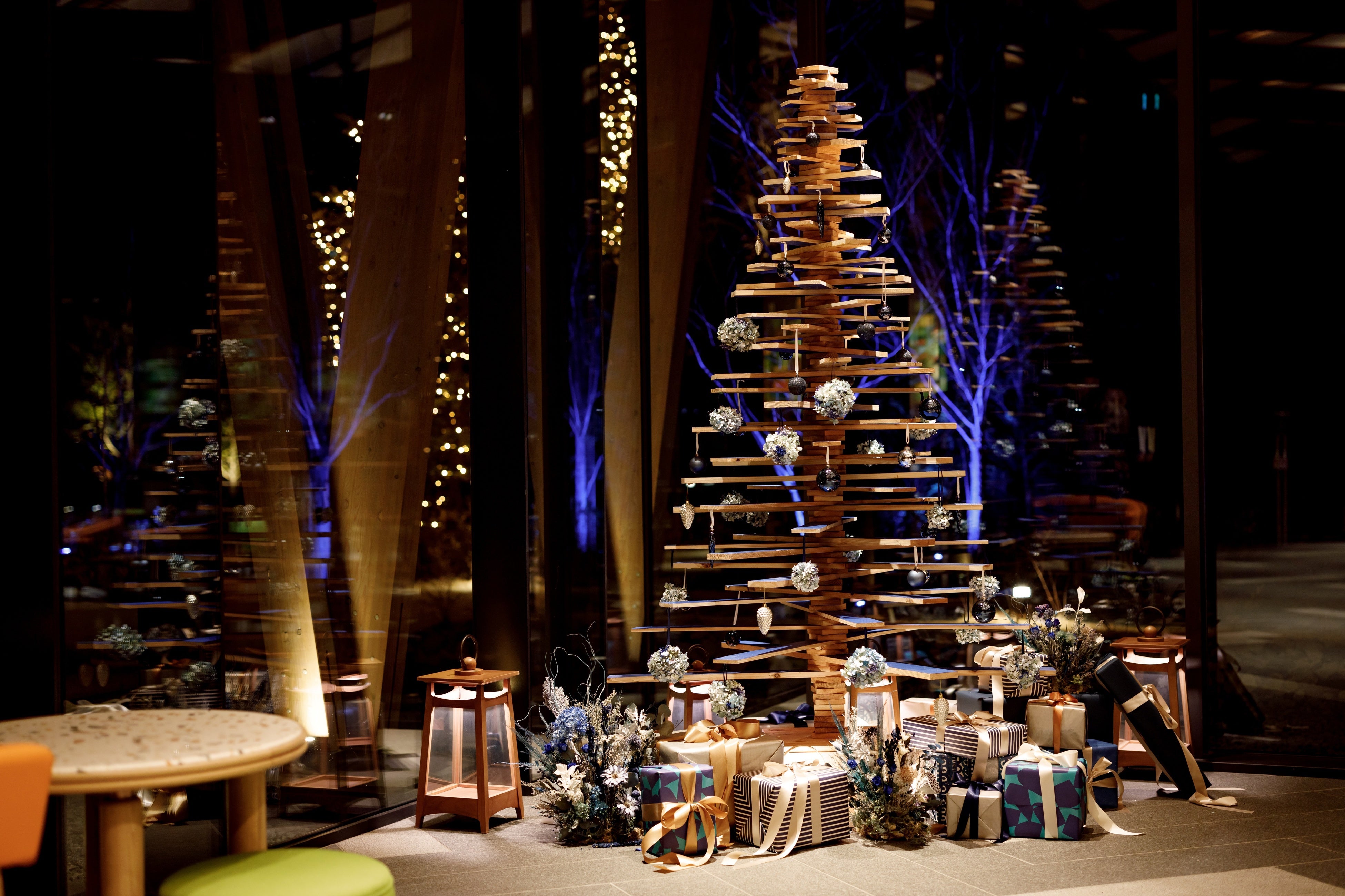 今年のクリスマスデザインテーマは「Unite Blue Xmas」。「ロスフラワー」に新たな命を吹き込む活動をする、株式会社RINが装飾を監修しました。長野県の間伐材とロスフラワー(廃棄予定の花)、地元の軽井沢学園の子どもたちの協力を結集(Unite)し、Blueのテーマカラーで、美しい冬の軽井沢を表現しています。温かみのあるブルーのツリーとオブジェがお客様をお出迎えします。ホテル周辺の街の魅力「ネイバーフッドストーリー」をコンセプトとする、ホテルインディゴ軽井沢ならではのデコレーションです。