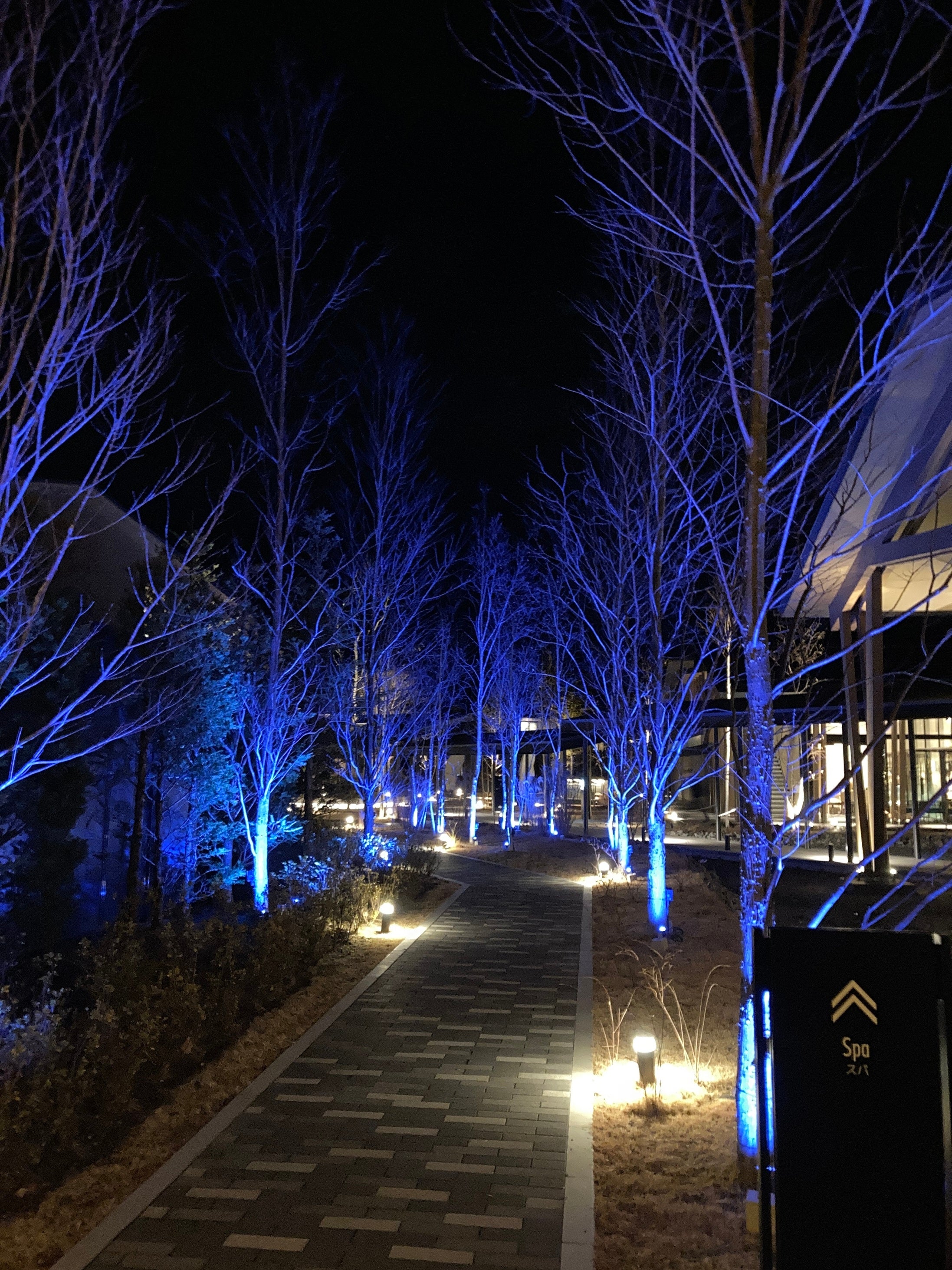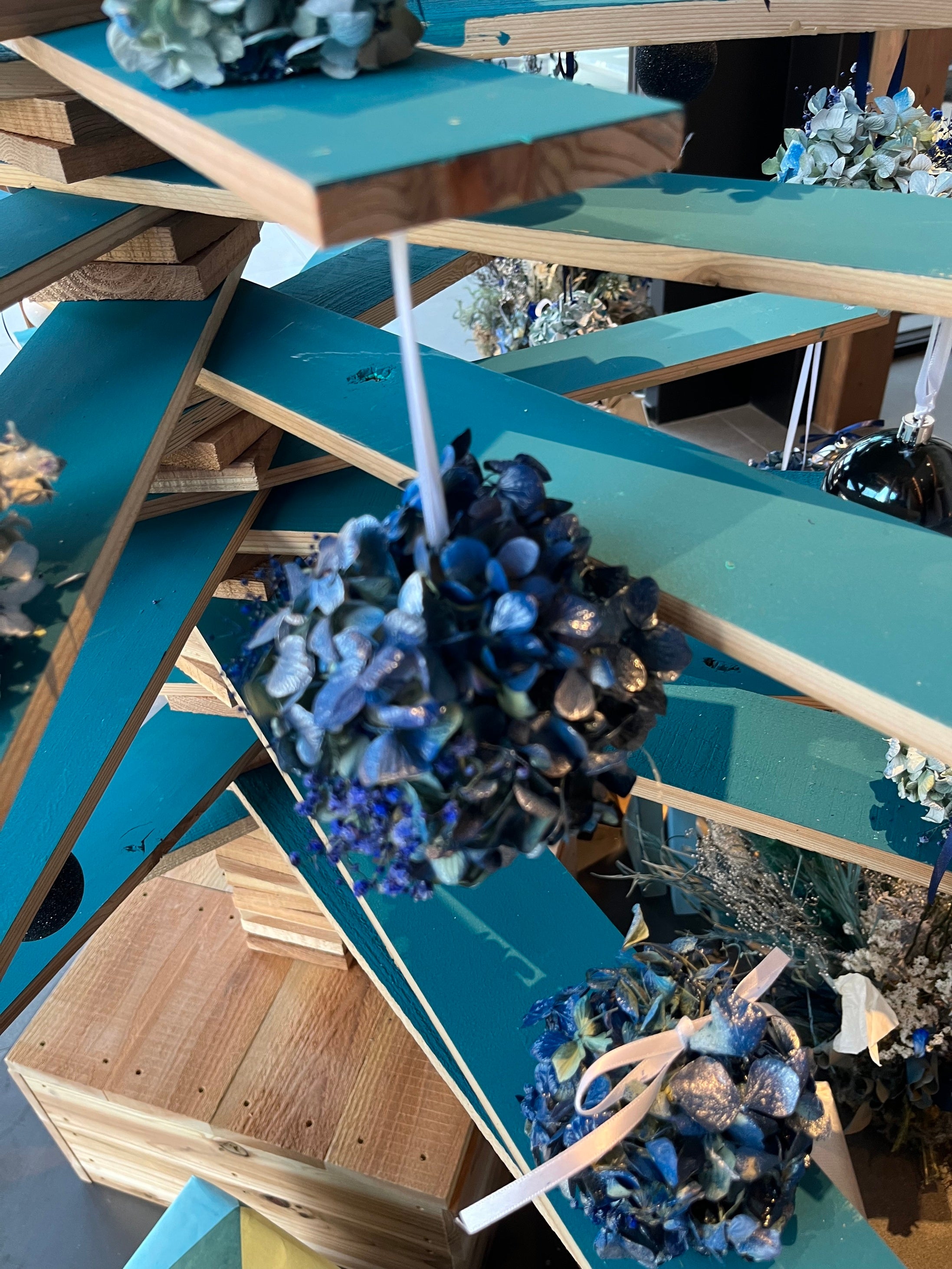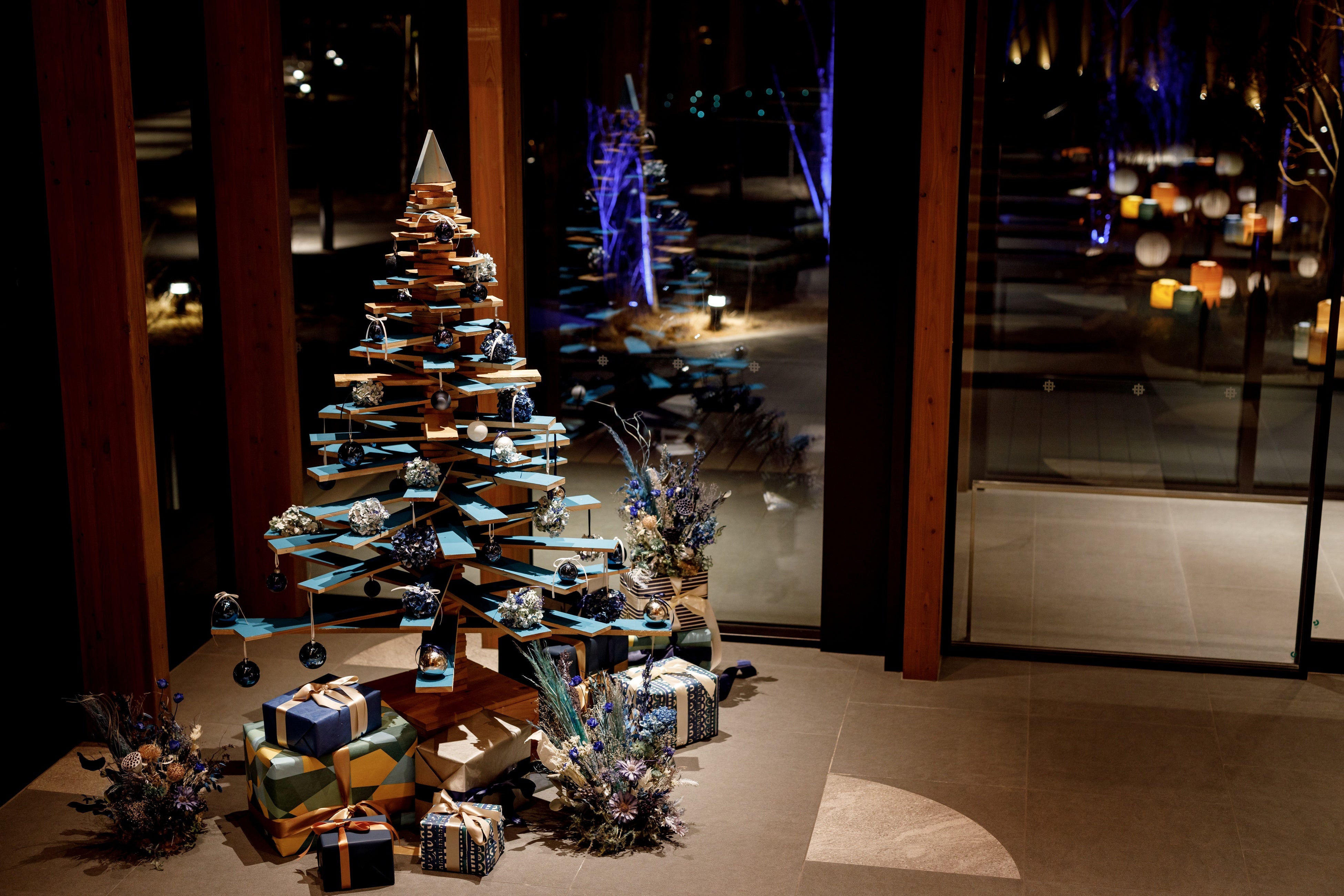 ロビーラウンジとスパ棟の2体のツリーは、長野県根羽村の間伐材を使用したツリーをブルーに染め、ロスフラワーのオーナメントで飾り付けした、サステナブルなツリー。ロビーラウンジのツリーは軽井沢の「夜」の空、スパ棟のツリーは「昼」の空をイメージし、アートとしても楽しめる見た目のユニークさも兼ね備えています。間伐材で作られたツリーは、組み立て式でリメイクできる点もサステナブルなポイントです。来年度以降もリメイクして使用していく予定です。