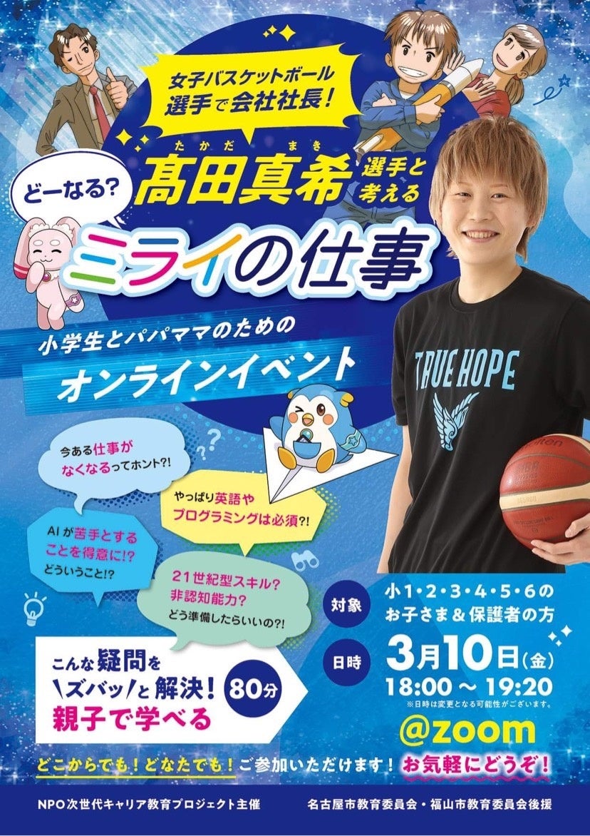株式会社ミライメイク(本社:名古屋市 代表取締役:鹿嶌将博)が運営するオンラインスクールDreamDrivenがイベントに登場します。2023年3月10日(金)18時から開催される小学生親子対象の無料オンラインイベント「どーなる?ミライの仕事」(主催:NPO次世代キャリア教育プロジェクト)。日本中を熱狂させたオリンピック女子バスケットボール代表でキャプテンを務めた髙田真希選手と一緒に、ミライの仕事について考える80分です。このイベント内でDreamDrivenは前半のミニ授業を担当。新しい時代を生きる子どもたちに必要な知識をお届けします。