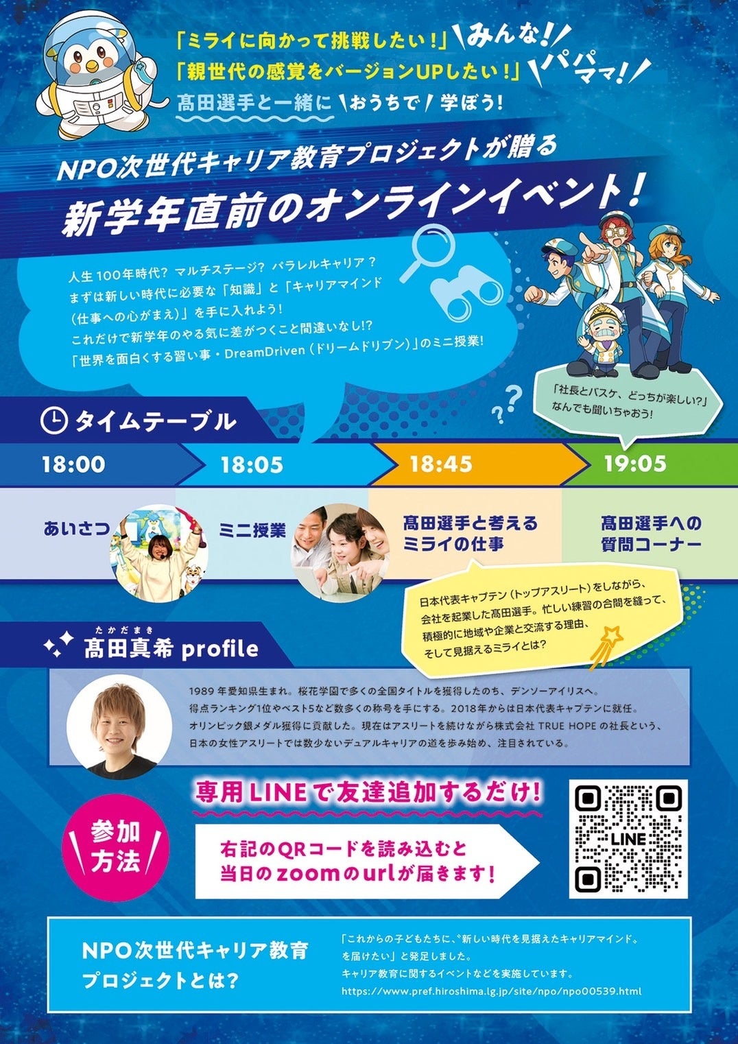 NPO次世代キャリア教育プロジェクトは、名古屋市教育委員会・福山市教育委員会から後援を受け、この春、新学年に上がる前の小学生親子を対象とした無料オンラインイベントを開催します!