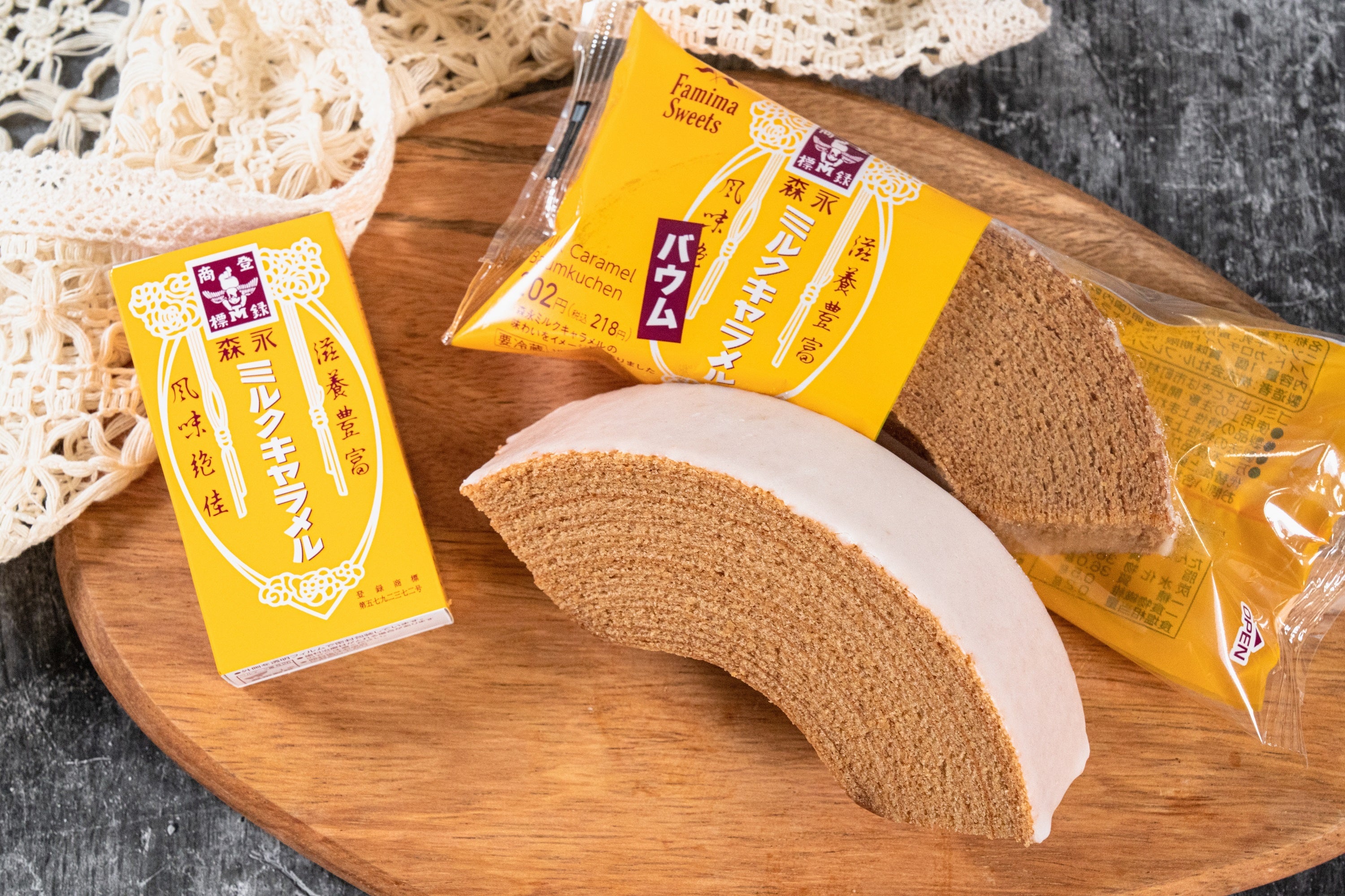 【内容】森永製菓「ミルクキャラメル」の味わいをイメージして作りました。森永キャラメルソースを加えた、しっとり食感のバウムクーヘンです。外側にはグレーズをコーティングし、よりキャラメルのおいしさが引き立つ仕立てにしました。あの懐かしい味わいを、バウムクーヘンで感じていただけます。
