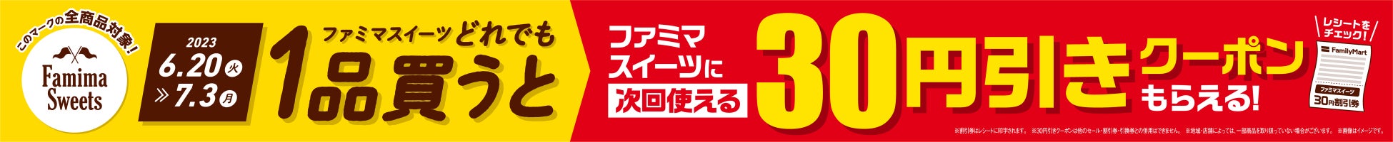6月20日(火)から7月3日(月)までの期間中、ファミマスイーツのマークがついた商品をどれでも1品ご購入いただくと、次回会計でファミマスイーツに使える30円引きクーポンがもらえるキャンペーンを実施します。クーポンを利用し、おトクにファミマスイーツをお楽しみください。