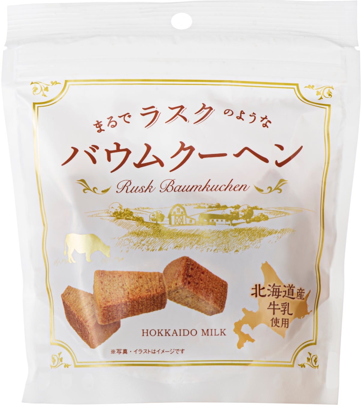 バウムクーヘンの生地に北海道産牛乳を使用する事で、通常よりコクと風味が豊かなこだわりのバウムクーヘンに仕上げています。
