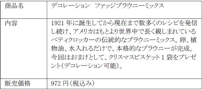 また、この「ブラウニーミックス」は、Wismettacフーズが総代理店契約をしているベティクロッカーの伝統的なブラウニーミックスです。1921年に誕生してから現在まで数多くのレシピを発信し続けてきたベティクロッカーは、アメリカはもとより世界中で長く親しまれており、卵、植物油、水だけで、本格的なブラウニーを作ることができます。今回の販売では、クリスマスビスケットがおまけで付いてくるため、ブラウニーにデコレーションしてお楽しみください。