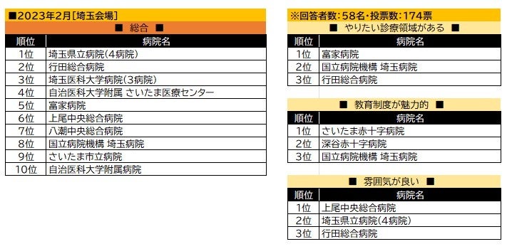 【埼玉版】の総合トップは埼玉県立病院。行田総合病院と国立病院機構埼玉病院が複数項目にランクイン。独自性のある診療科目を持つ富家病院が「やりたい診療領域がある」で首位に