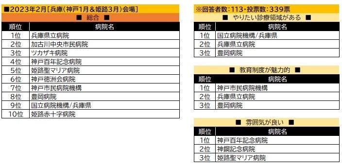 【兵庫版】では兵庫県立病院が総合トップで他2項目にもランクイン。「雰囲気が良い」上位3位は民間病院