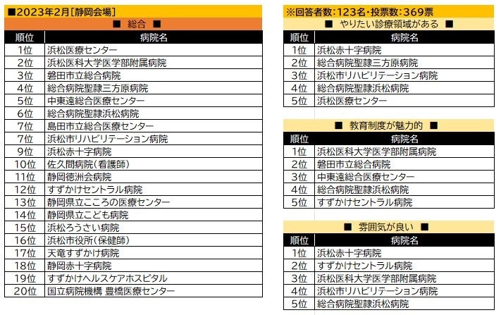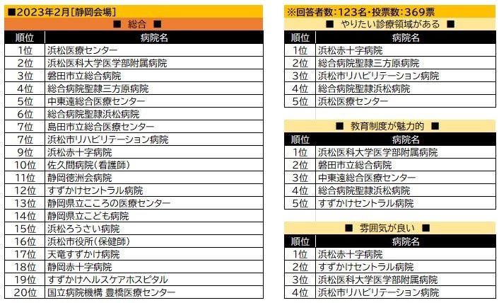 【静岡版】の総合1位は浜松医療センター。浜松赤十字病院は「やりたい診療領域がある」と「雰囲気が良い」の2項目で首位。「教育制度が魅力的」では浜松医科大学医学部附属病院がトップに
