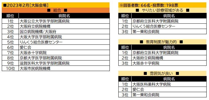 【大阪版】の総合1位は大阪公立大学医学部附属病院。京都府立医科大学附属病院は「やりたい診療領域」「教育制度が魅力的」の2項目で首位。「雰囲気が良い」で大学病院としては珍しく大阪医科薬科大学病院が首位に