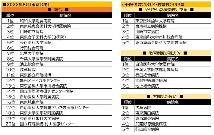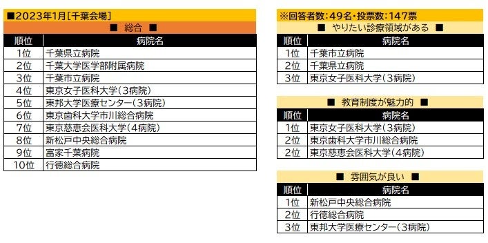 【千葉版】の総合トップは千葉県立病院。「教育制度が魅力的」ではトップの東京女子医科大学(3病院)を筆頭に3位までが大学病院。そのほか項目でも国公立大学病院が多くランクインした