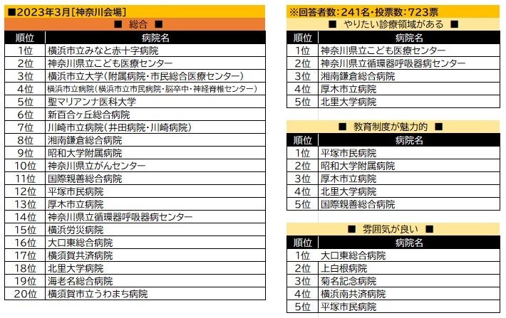 【神奈川版】は横浜市立みなと赤十字病院が総合トップに。「教育制度が魅力的」の首位の平塚市民病院は「雰囲気が良い」病院にもランクイン