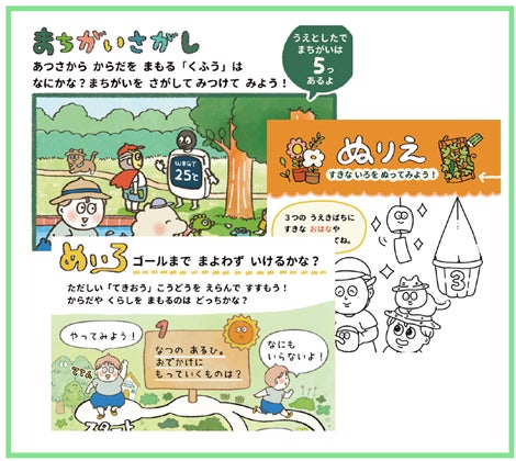 こども版『A-PLAT BOOK KIDS』には「間違い探し」「ぬりえ」「めいろ」等を随所に取り入れ、小さなお子様が楽しみながら気候変動の適応アクションへの理解を深められるよう工夫。