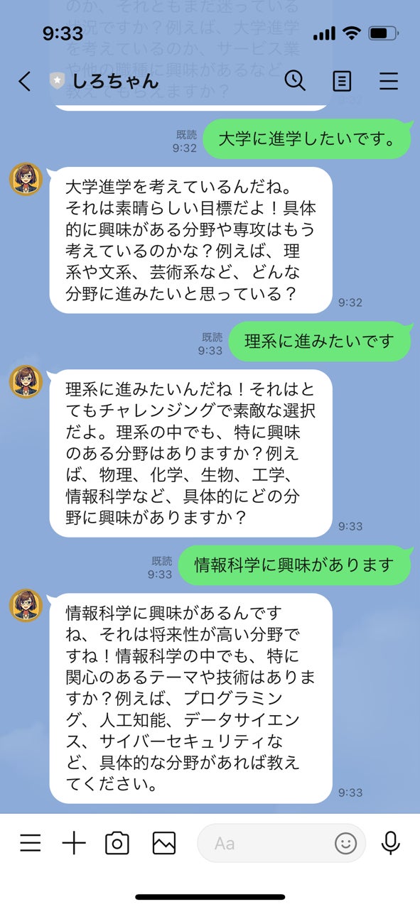 現代では、進路選択の幅が広がっており、職業や大学の学部も多様化しています。そんな時代に重要なのは、自分の知らなかった世界を知ることです。「しろちゃん」は、ただおすすめの学校や職業を紹介するだけでなく、ユーザーの興味や価値観をヒアリングしながら、一人で自己分析を行うよりも幅広い可能性を提案します。