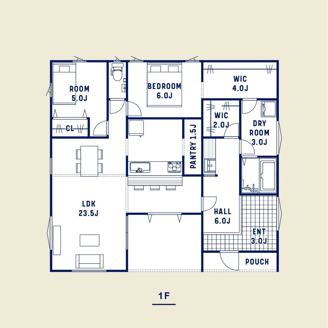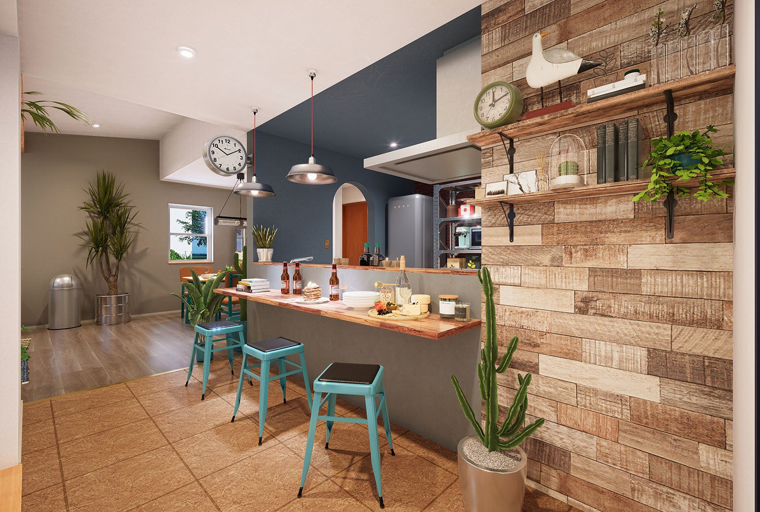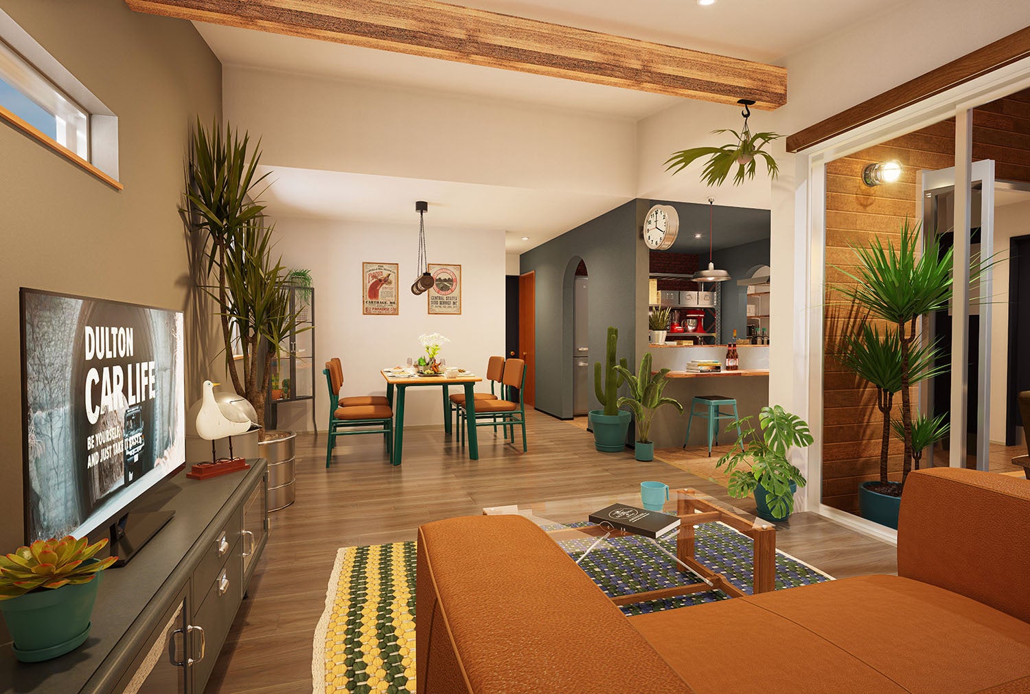 DULTON HOME初の平屋商品となり、第二のリビングとして使用できる半屋外のポーチや広々とした土間、多様性のあるカウンターなど細部にまで拘り、住む人それぞれのライフスタイルをDULTONアイテムと共に楽しんでいただけるプランとなっています。
