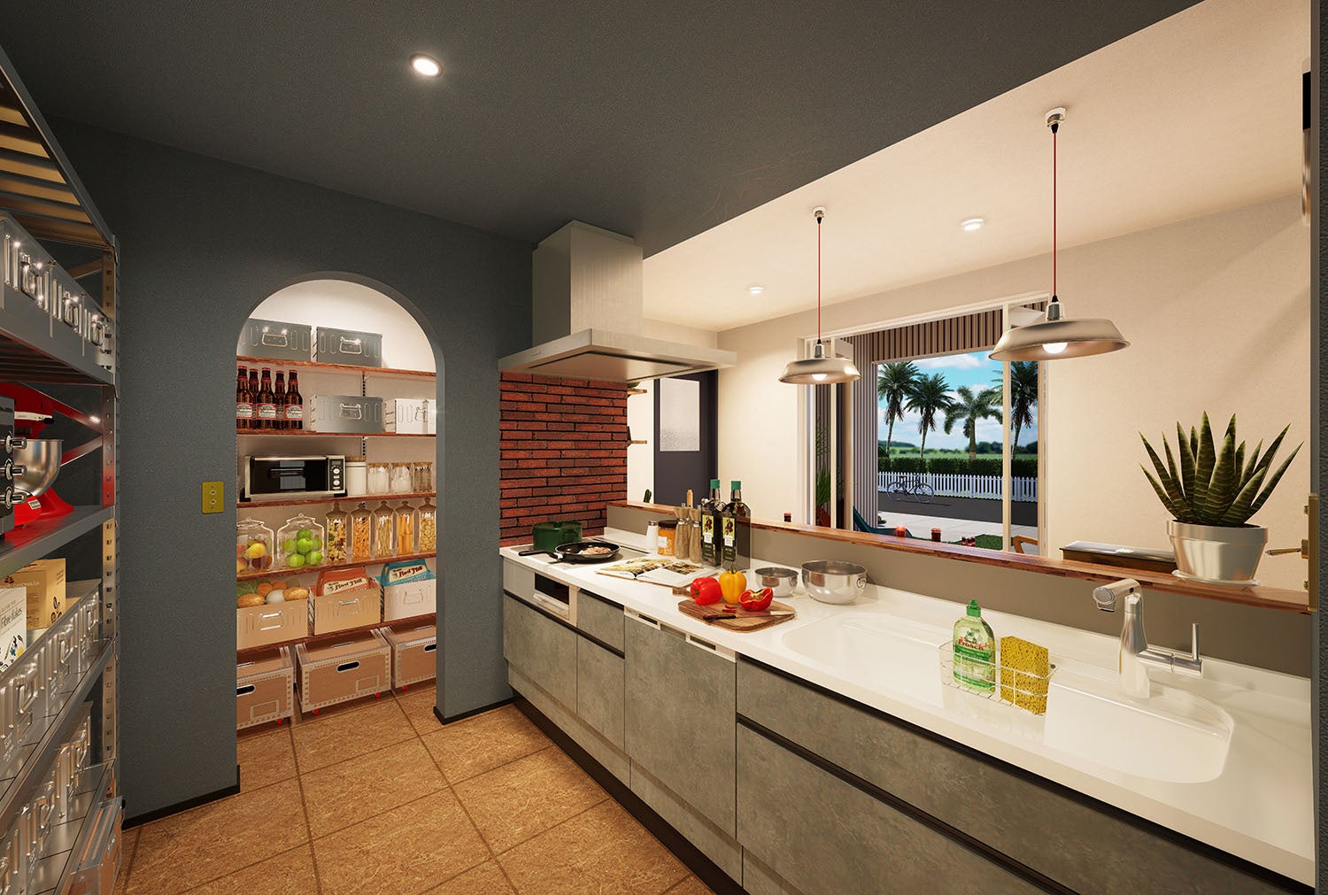 背面にも充分なサイズの収納家具を設置できるスペースが設けられており、毎日が便利で快適なキッチンライフに。