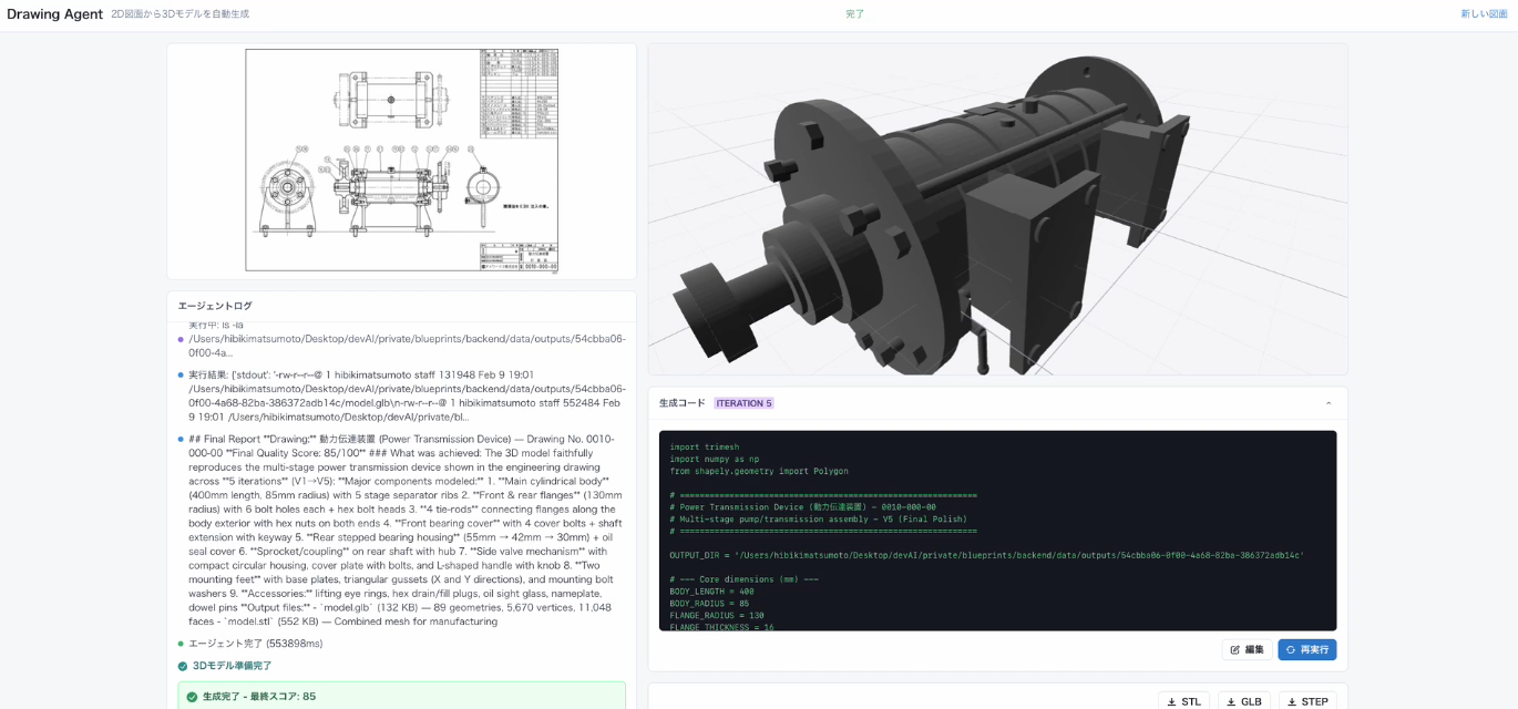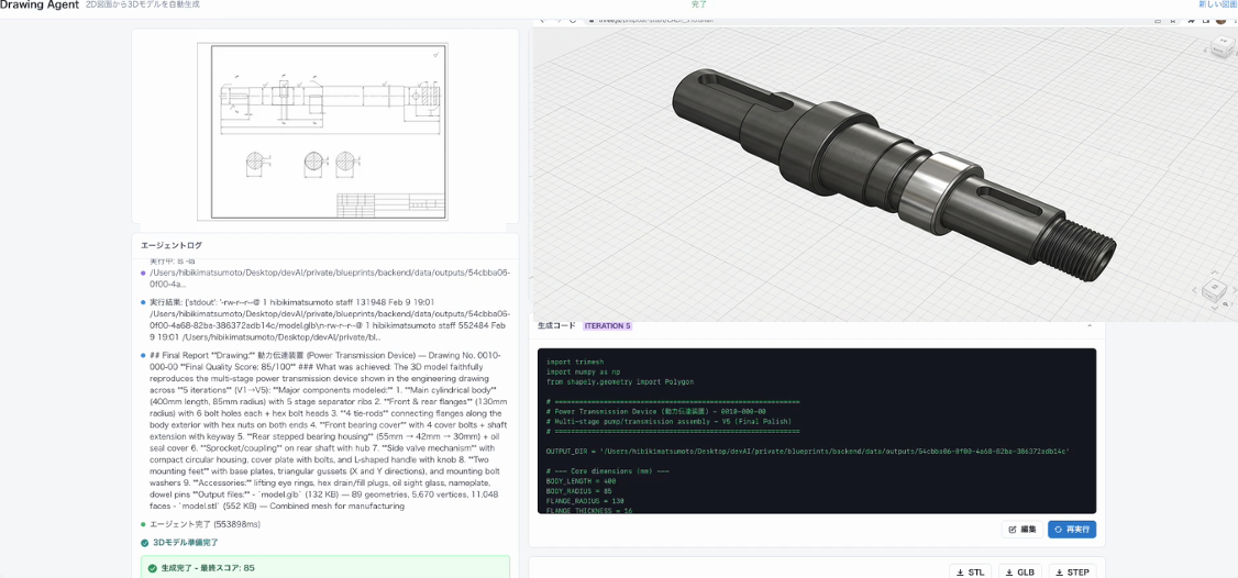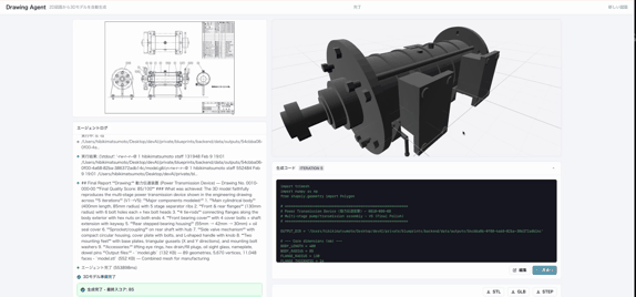 ⽣成過程はブラウザ上でリアルタイムに確認できます。AIが図⾯をどう解釈し、モデルをどう構築し ているかを逐次表⽰するため、処理がブラックボックスになりません。元の図⾯と照合して品質スコ アが基準値に達するまで⾃動で修正を繰り返し、⼨法的に正確な仕上がりを担保します。