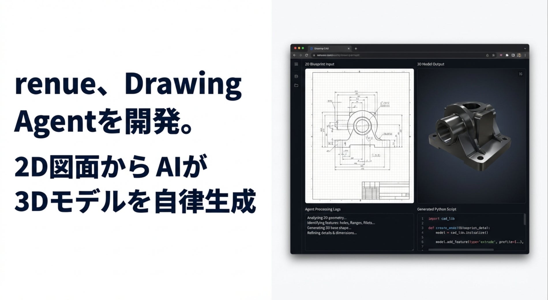 renue、Drawing Agentを開発。2D図⾯からAIが3Dモデルを⾃律⽣成