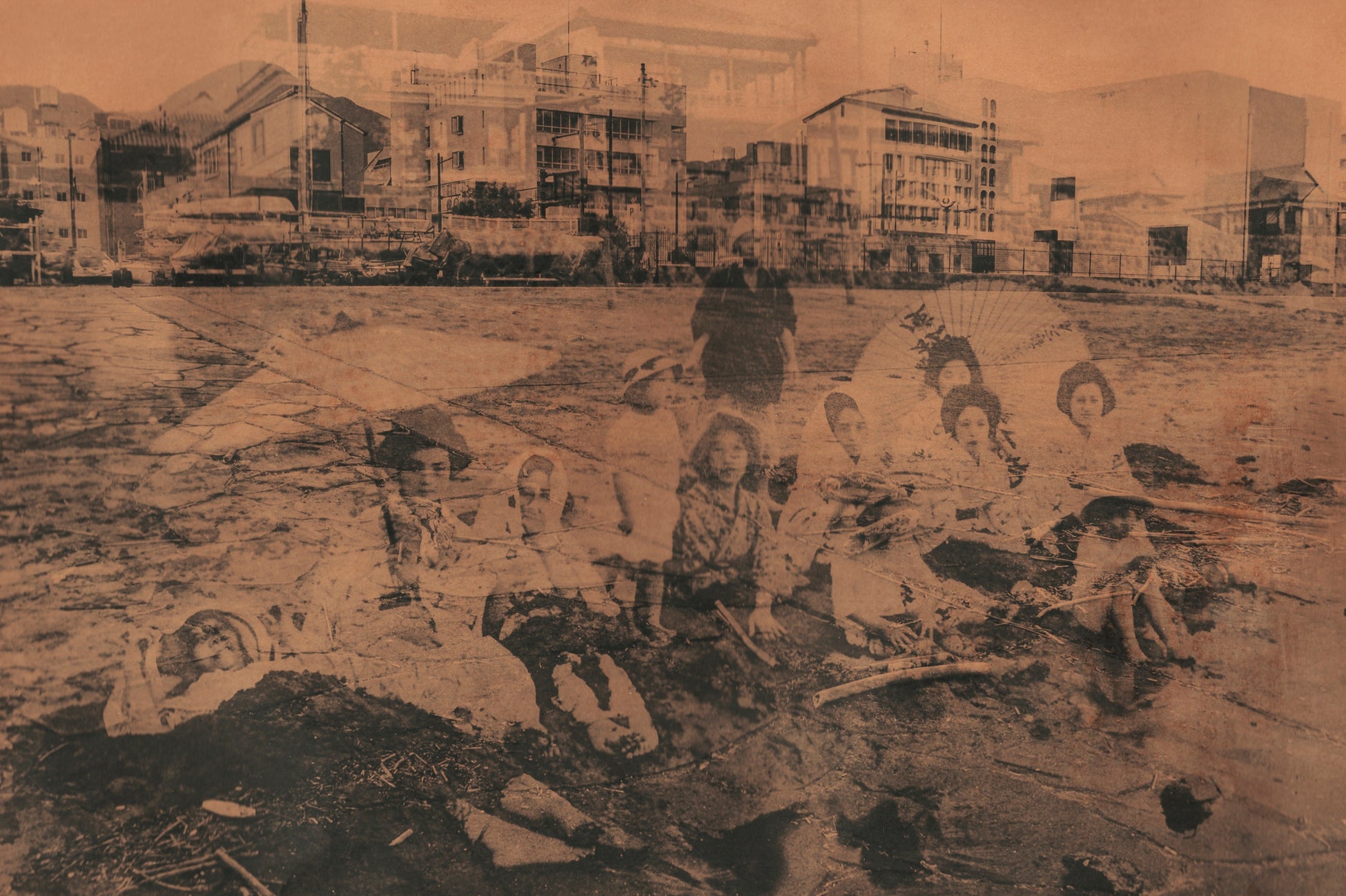 およそ100年前の大分県別府市の風景と現在の別府市を同じ場所で撮影して写真を重ね合わせました。その後、50年前の雨水であった温泉水を使い、柿渋と温泉水を使って色が変化する温泉染めを行いました。100年前の人たちが描いた未来、私たちが見る100年前の過去。現在、日本一の温泉地である別府は、温泉の過剰なくみ上げや地熱発電の開発などにより、源泉の温度が低下する事によって温泉が減少しています。天からの恵である温泉は、100年後の未来にも残っているのか?
