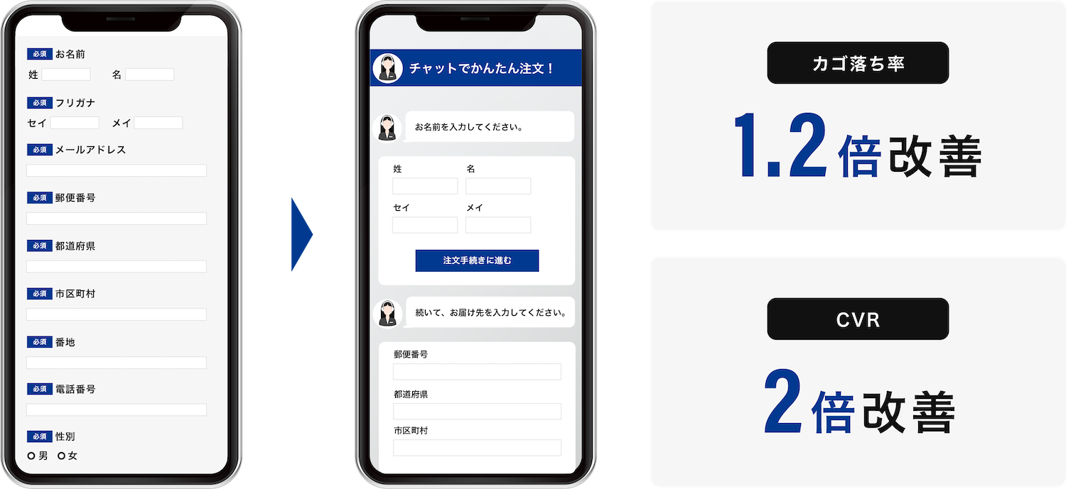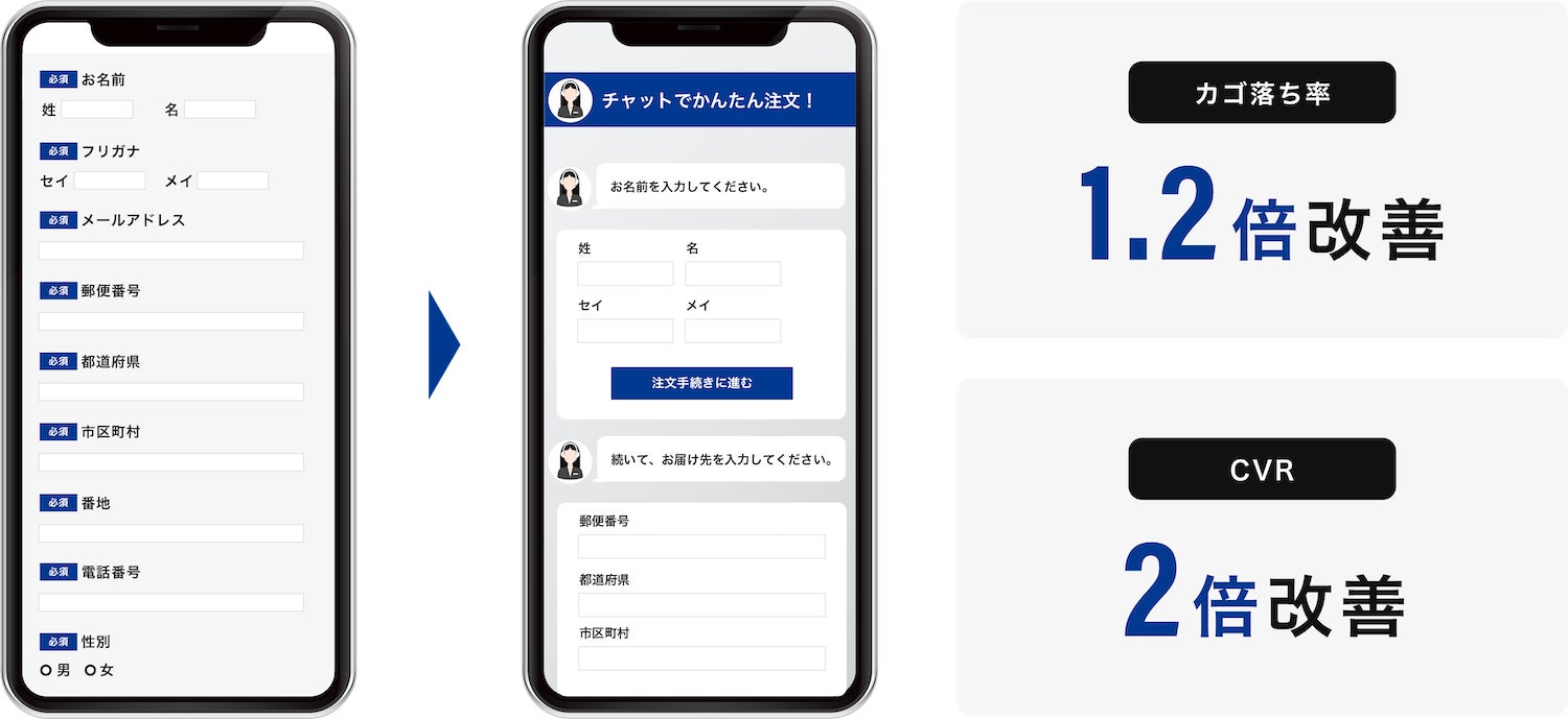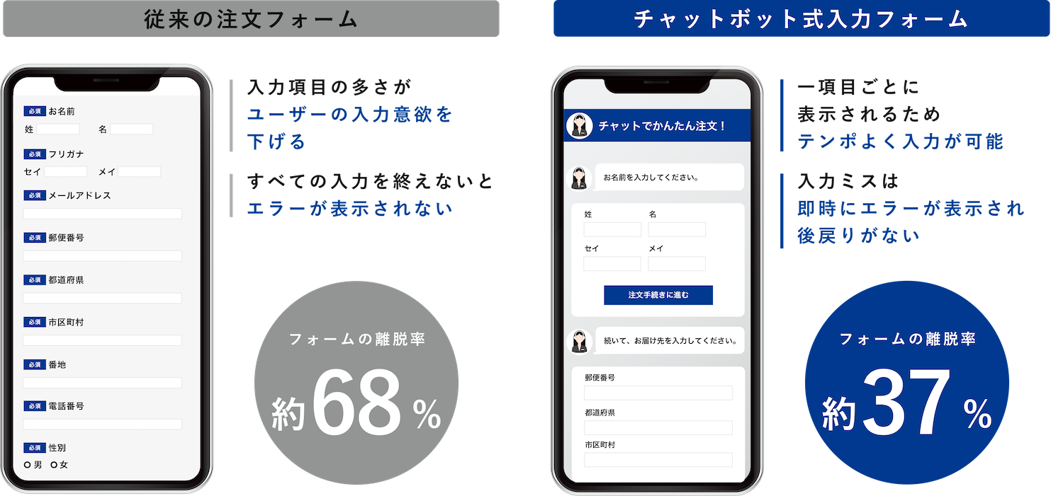 従来の縦長の入力フォームから、対話型の「ECチャットボット」へ置き換えた事例では、以下の実績がございます。
