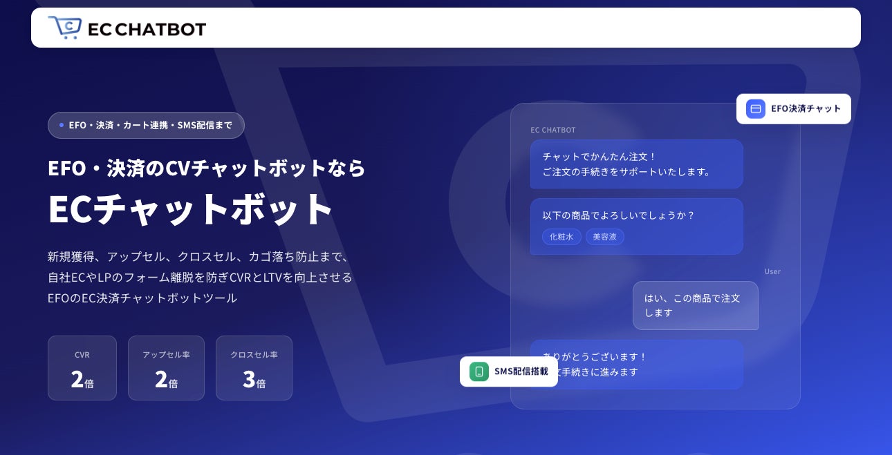 ECチャットボットは、「決済」と「EFO」の2つのCVR改善機能を備えた新規顧客獲得に特化したチャットボットです。業種や目的に合わせた最適化が可能です。