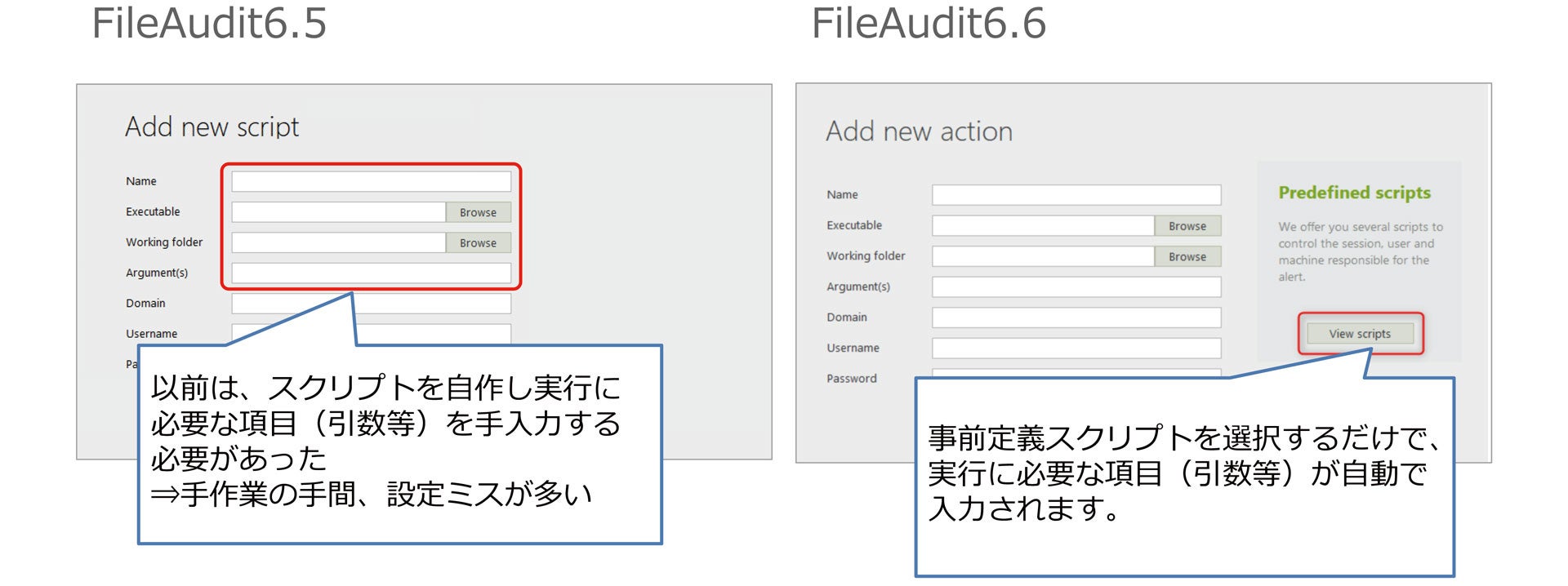 FileAudit 6.5までは、不審なアクセスを検知した際に、自動で実行するアクションスクリプトについては実行に必要な項目(引数等)を手動入力して自作する必要がありましたが、FileAudit 6.6ではセキュリティ対策で多く利用する一般的なアクションスクリプトが事前に搭載されています。