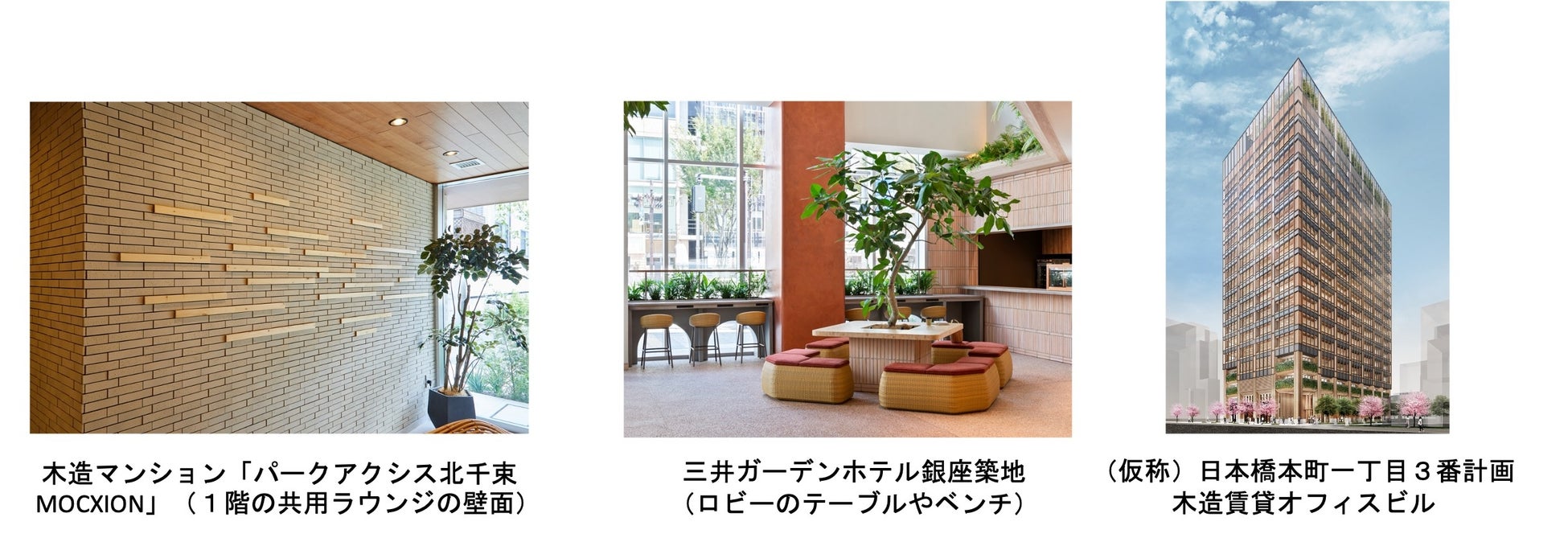なお、伐採適期を迎えて計画的に伐採した木材、森のメンテナンスのために間伐した木材は、木造賃貸ビルや木造住宅などの主要部材、各施設の仕上材のほか、住宅のフローリング材の下地やオフィス家具、商業施設共用スペースのベンチや遊具として使用するなど、グループ企業で幅広く、積極的に活用しています。