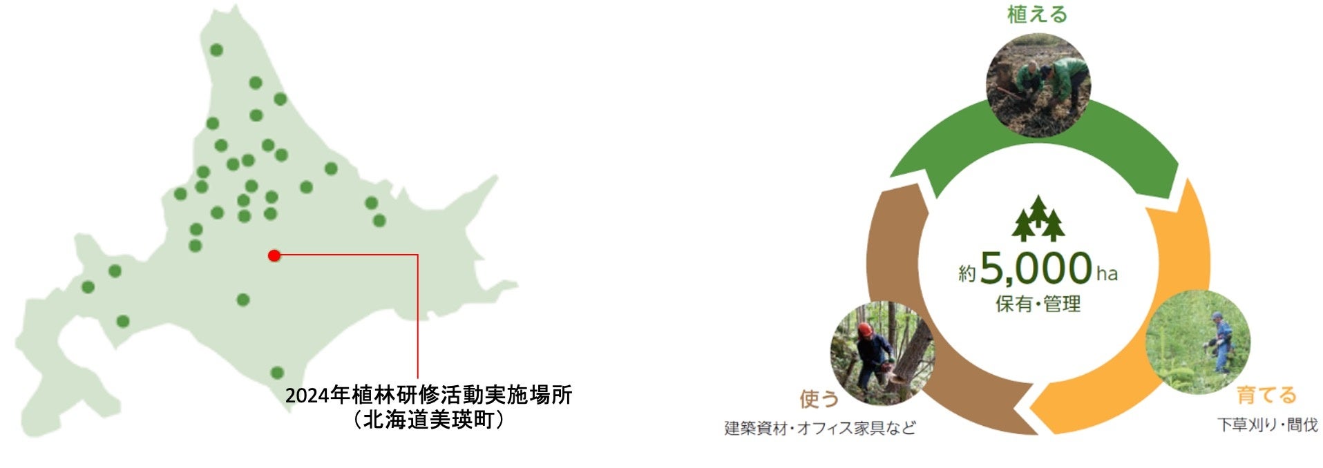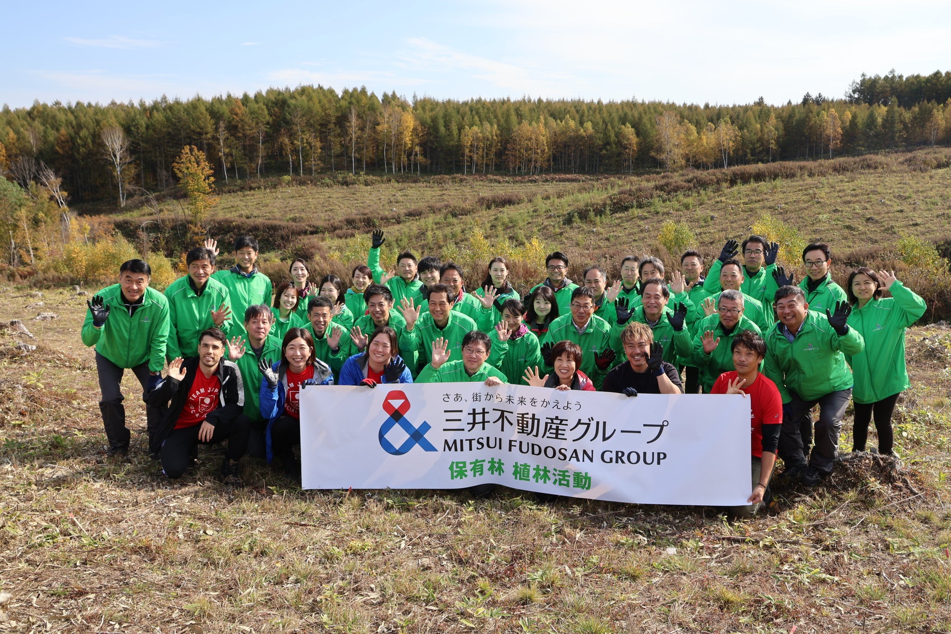 三井不動産グループは、「&」マークに象徴される「共生・共存」「多様な価値観の連繋」「持続可能な社会の実現」の理念のもと、グループビジョンに「&EARTH」を掲げ、社会・経済の発展と地球環境の保全に貢献しています。この保全活動の一環として、北海道に約5,000ha(東京ドーム約1,000個分以上)の森林を保有し、持続可能な“終わらない森”創りに向けて、「植える」「育てる」「使う」のサイクルを確立しています。実際にこのサイクルを社員にも体験してもらうために、2008年から社員研修の一環として植林研修を行っています。