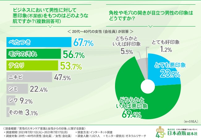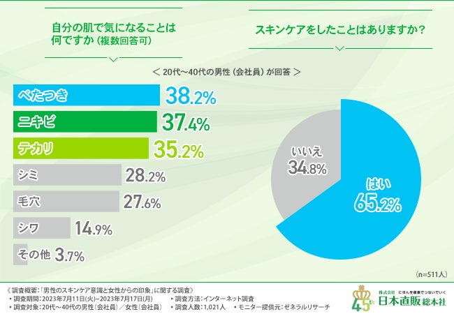 そこで、株式会社日本直販総本社(https://www.nippon-chokuhan.jp/)は、20代~40代の男性と女性を対象に、「男性のスキンケア意識と女性からの印象」に関する調査を実施しました。