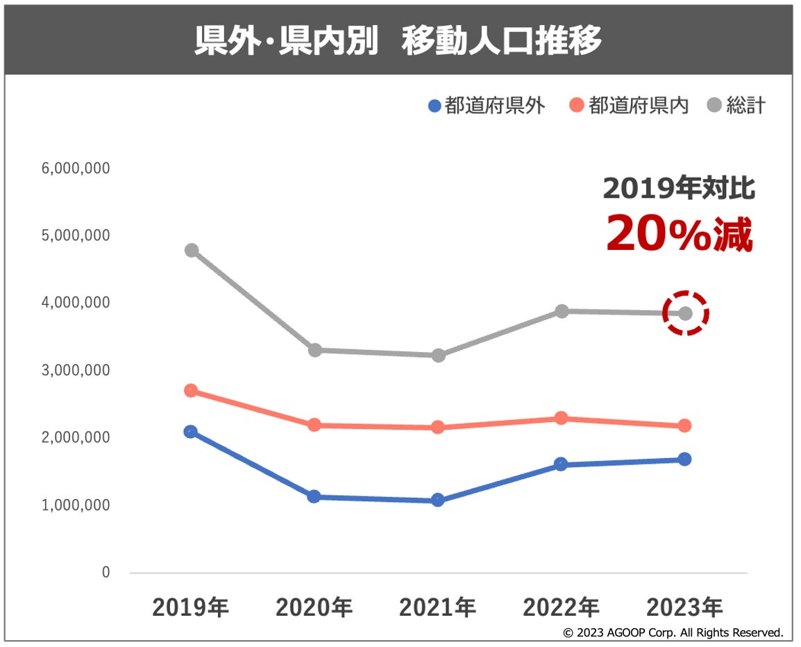 2023年の関東1都3県から県外・県内への移動状況は、コロナの影響により県外移動が大幅に減少していたが、2022年に引き続き回復傾向にあります。しかしコロナ禍前の2019年の水準までは戻っていません。