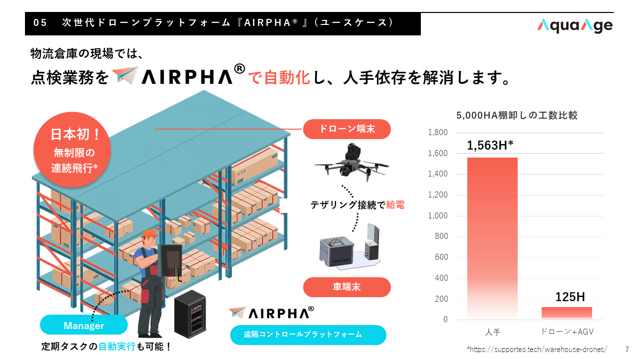 また、AquaAgeはフィジカルAI(Physical AI)の研究開発にも注力しており、ドローンとロボットを連携させ、マルチモーダルAIによる自律制御を用いた倉庫(非GPS環境)における点検・棚卸業務の自動化システム「AIRPHA®」を中核事業として推進しています。