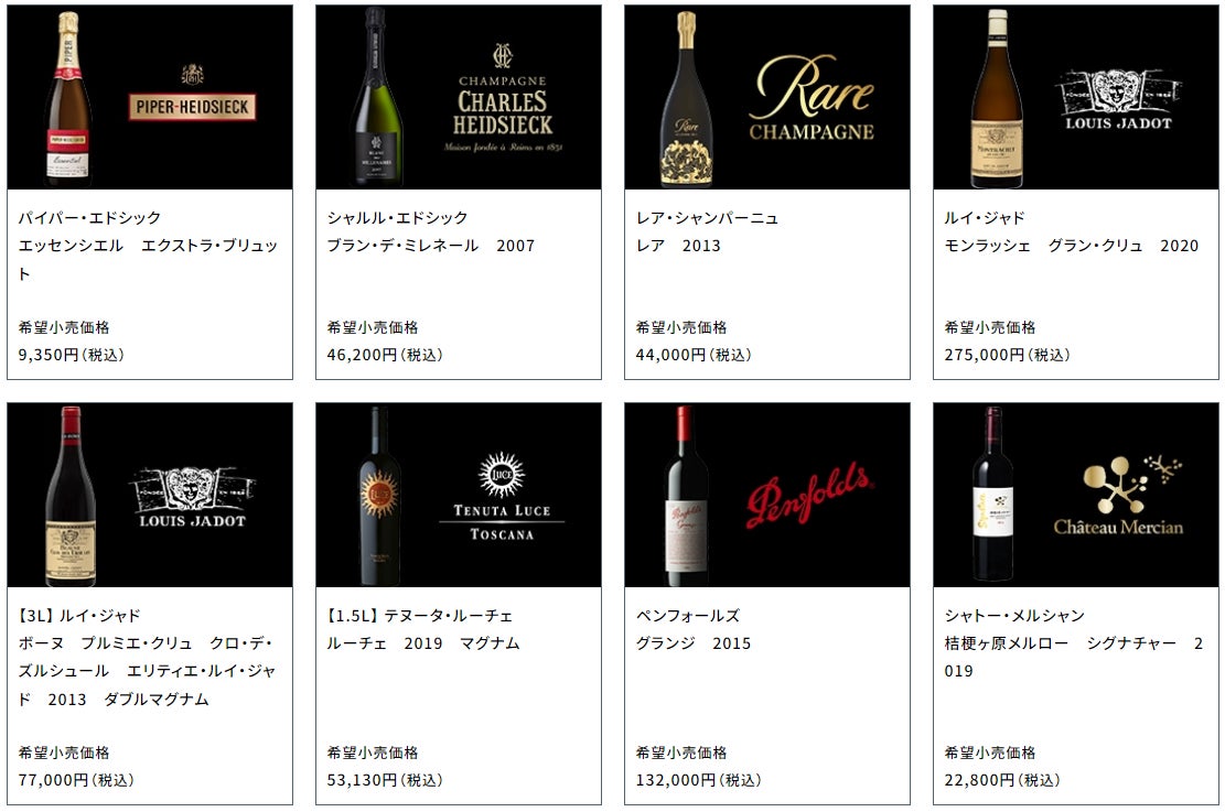 また、ワインのラインナップは、ブルゴーニュ、シャンパーニュを中心に、世界各国のトップクラスのワインと、数量限定のシャトー・メルシャンまで、厳選したワインを50種類以上ご用意いたします。このラインナップを一度にご紹介できる機会はなかなかありません。