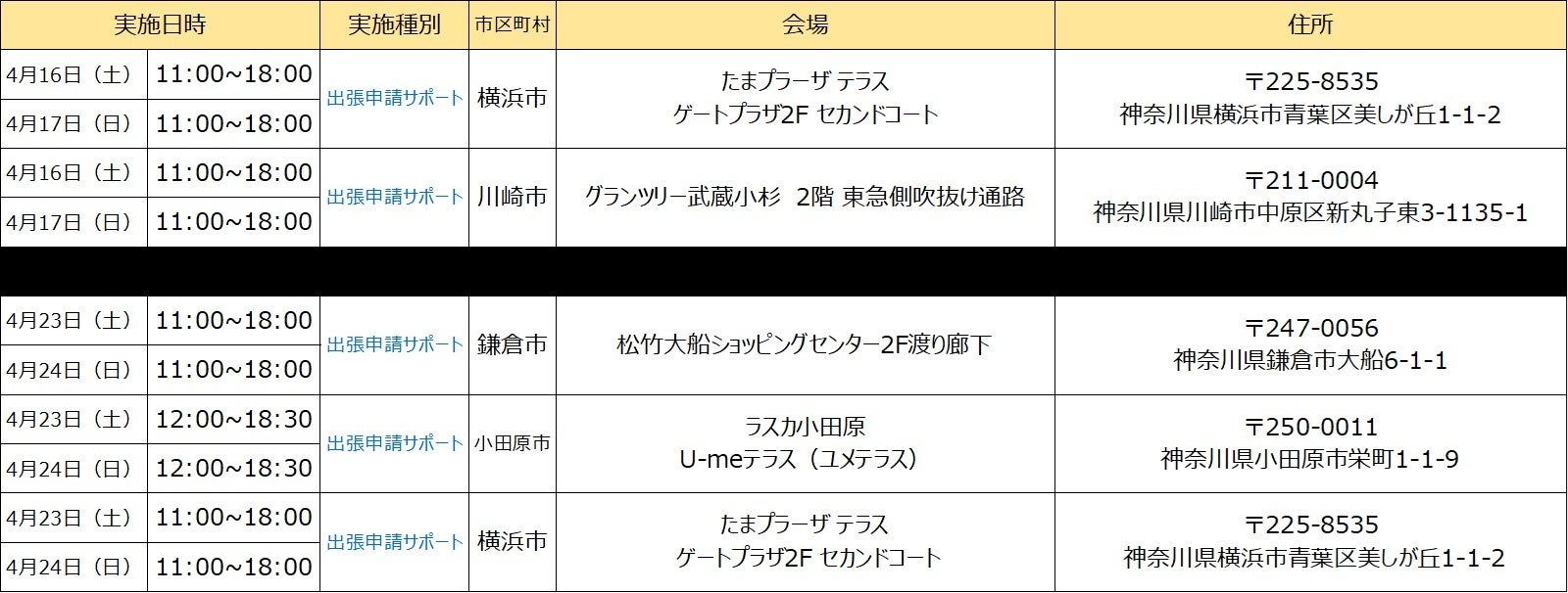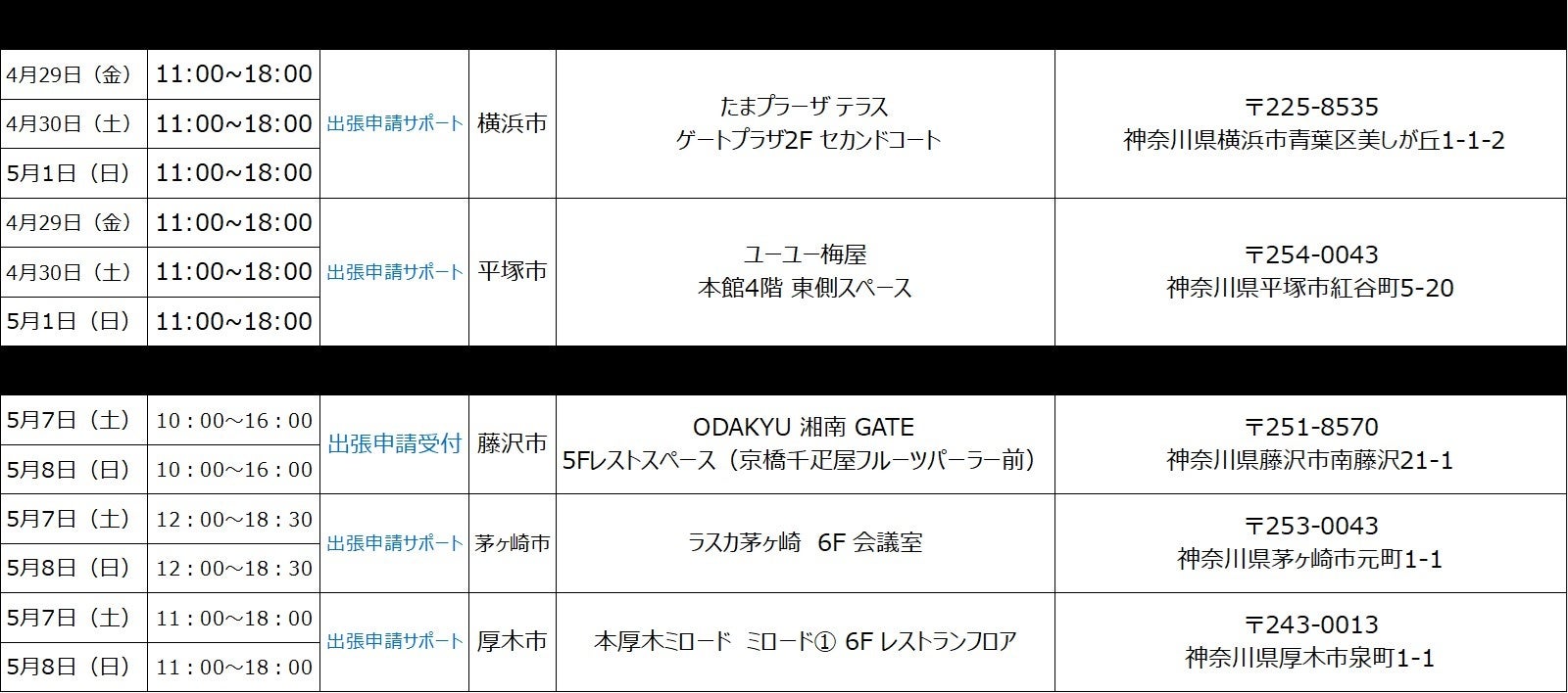 ※開催場所の調整状況や新型コロナウィルスの感染状況等により、「出張申請受付」及び「出張申請サポート」の開催を中止・延期、または実施内容が変更となる可能性がございます。