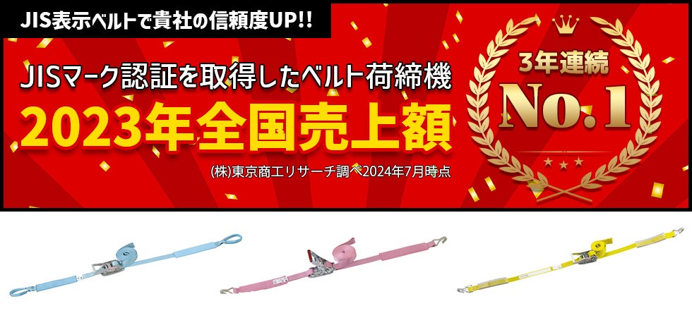 「働く車のサポート」をモットーとする株式会社パーマンコーポレーション(本社:大阪市西区、代表取締役:中部祥元)は、2024年7月JIS規格「JIS B 8850」について、JISマーク認証を取得したベルト荷締機(ベルトラッシング)で、3年連続全国売上額No.1(株式会社東京商工リサーチ調べ 2023年7月時点)になりました。