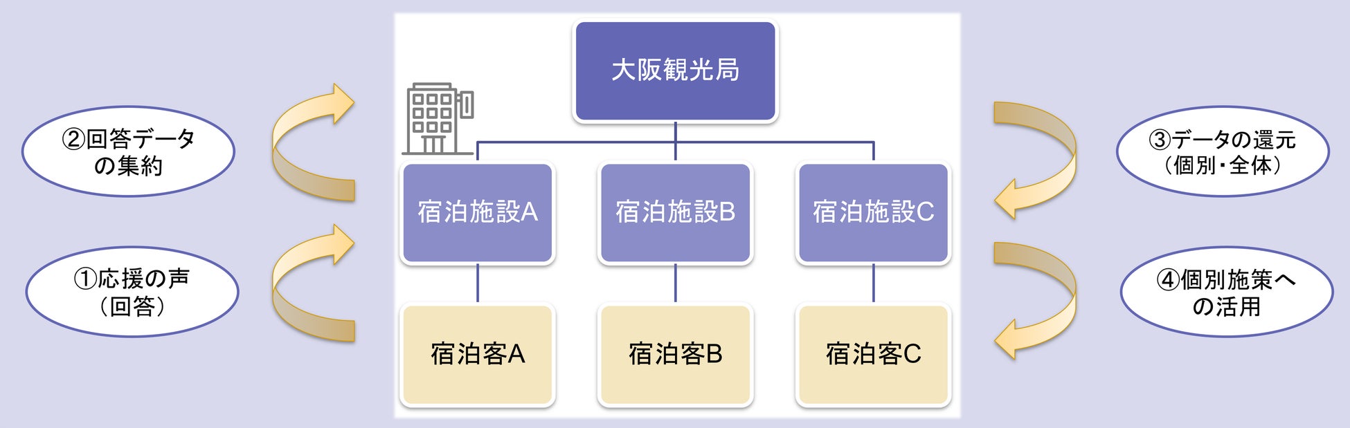 -アンケート内容も各ホテルの満足度ではなく、大阪への観光・宿泊に特化したものにすることで、宿泊施設は宿泊客の動向やニーズに応じた施策の検討が可能となります。